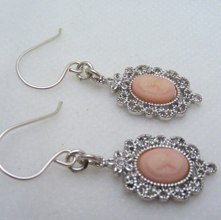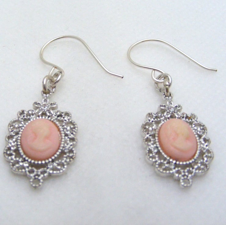 Earrings are handmade with, 25x15mm silver plated and pink cameos and hypo allergenic handmade silver plated ear wires.