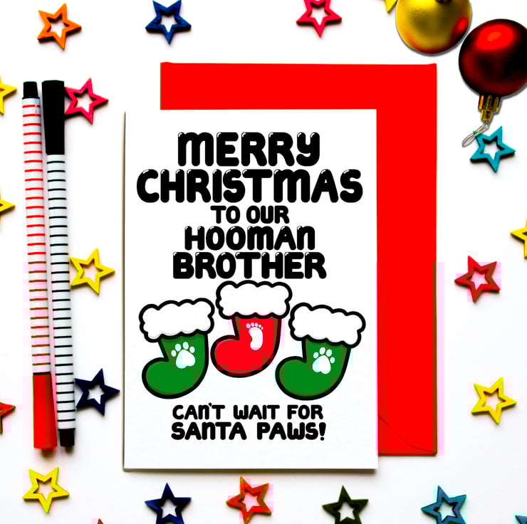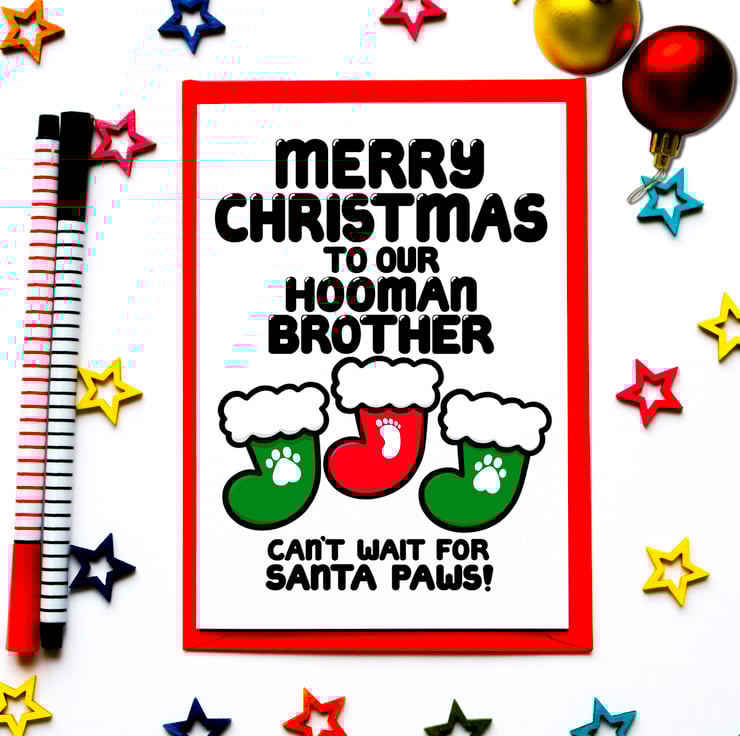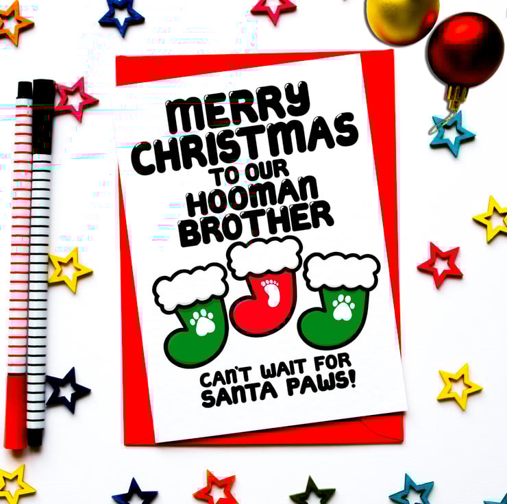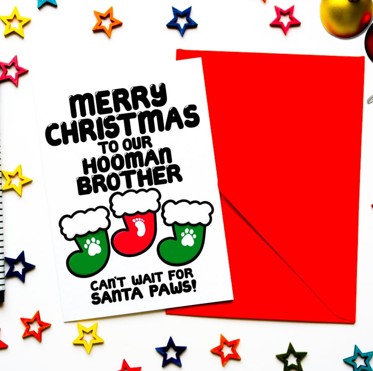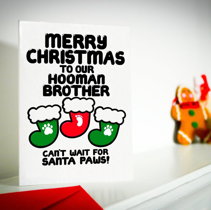 Get ready to bring some holiday cheer to your favorite human brother with this adorable and humorous Christmas card from your furry friends. Whether it's a wagging dog, a playful cat, or any paw-some pet, this card is the perfect way to send warm wishes and a little festive humour