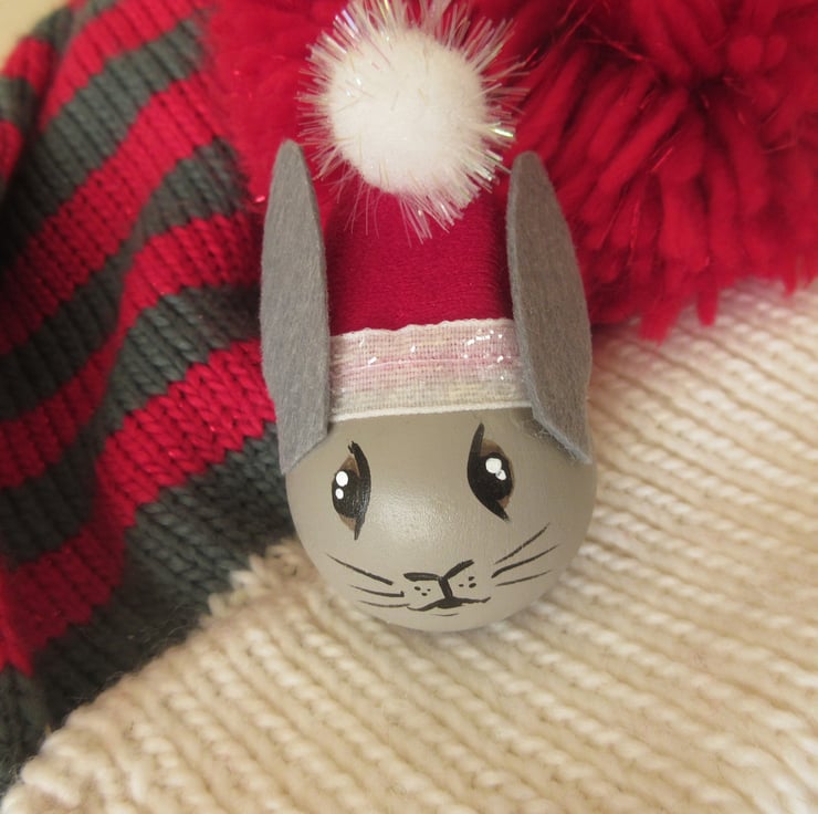 The rabbit wears a hand crafted mini Santa hat, which has a length of ribbon attached for hanging the decoration by.