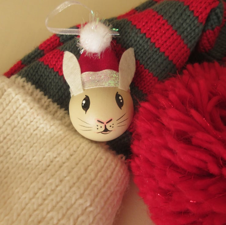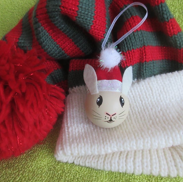 The rabbit wears a hand crafted mini Santa hat, which has a length of ribbon attached for hanging the decoration by.
