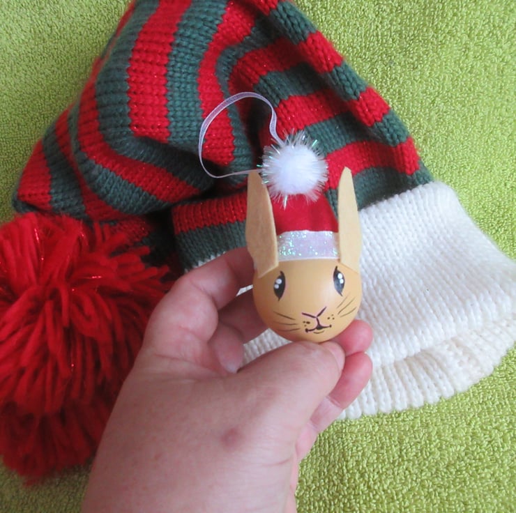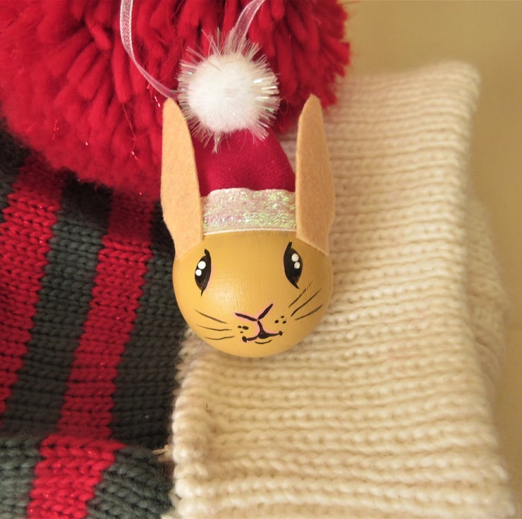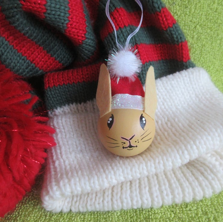 The rabbit wears a hand crafted mini Santa hat, which has a length of ribbon attached for hanging the decoration by.