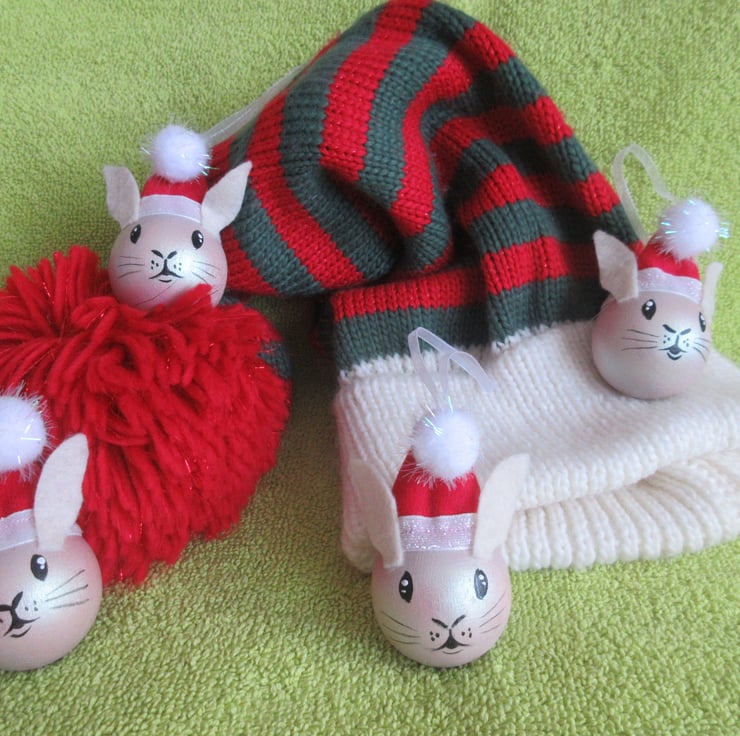 The rabbits wears hand crafted mini Santa hats, which have a length of ribbon attached for hanging the decoration by.