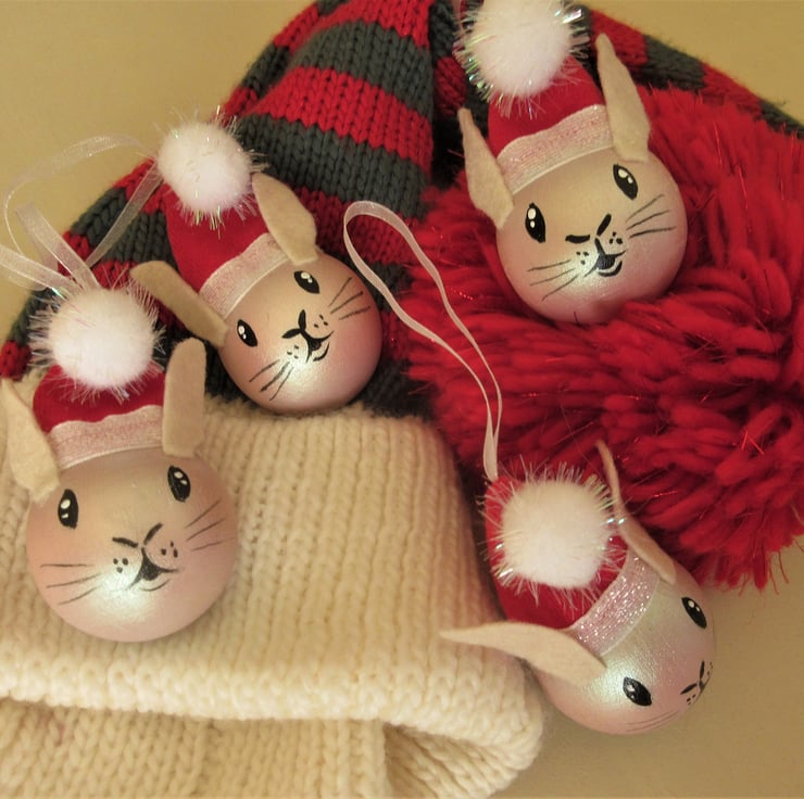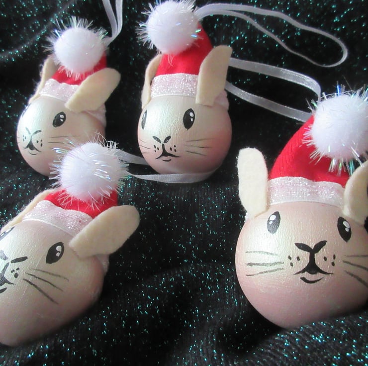 This is a set of four hand painted wooden rabbit Christmas decorations.
