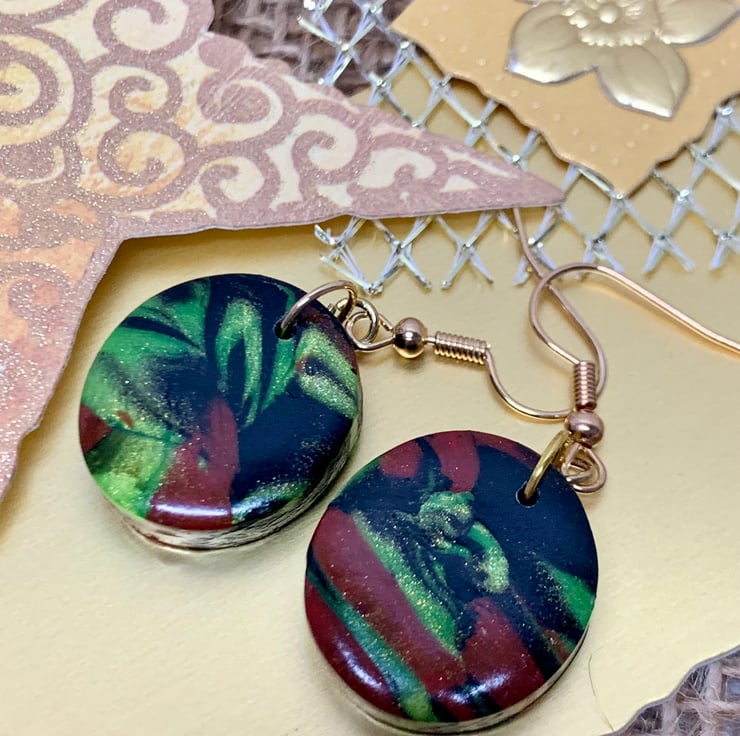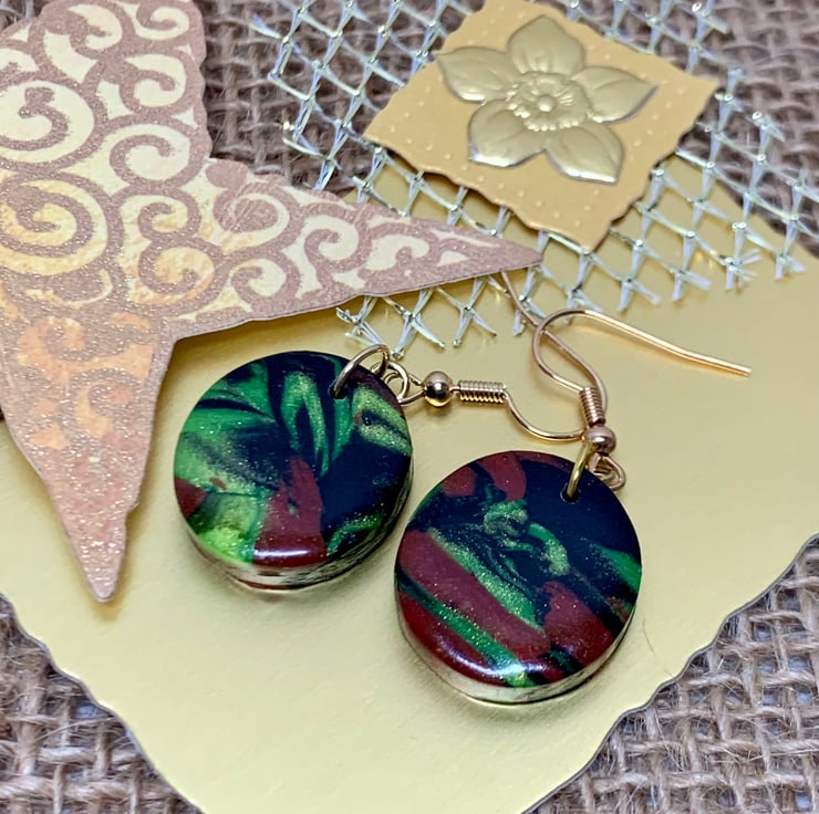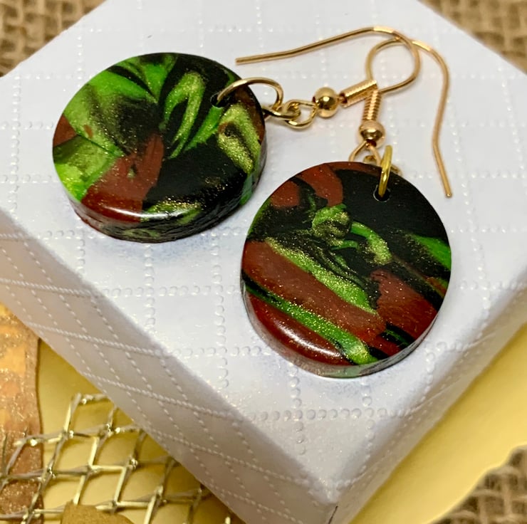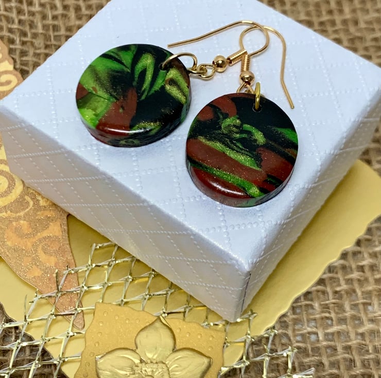 If you like One of a kind, bold and handmade you'll definitely love these round earrings. Made from polymer clay in bold shades of green,brown and black. To give them a little sparkle I've added a gold shimmer. These earrings are super lightweight so ideal to wear all day and especially good for those who do not like heavy earrings. Hung on a gold plated hook earring fitting.