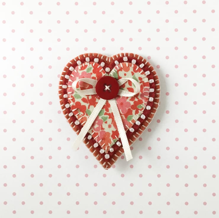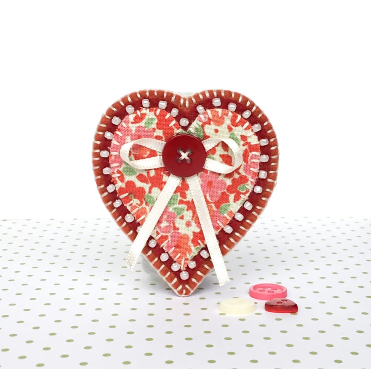 It features an appliqué heart in pretty floral fabric, sewn onto dark red felt and edged with cream seed beads. It has been further mounted onto a rust colour felt backing and is finished with a pretty button and ribbon detail.