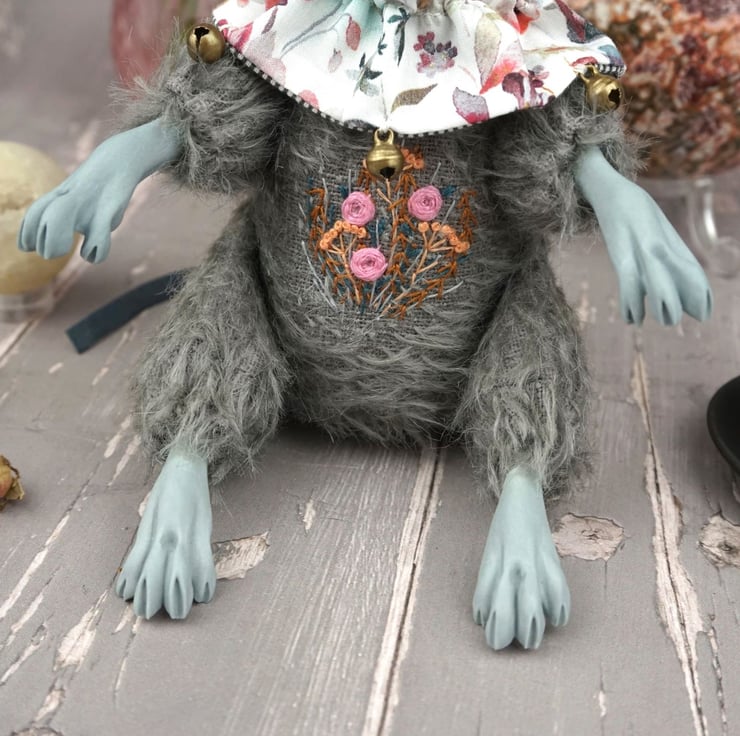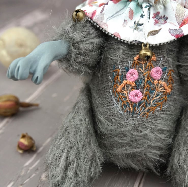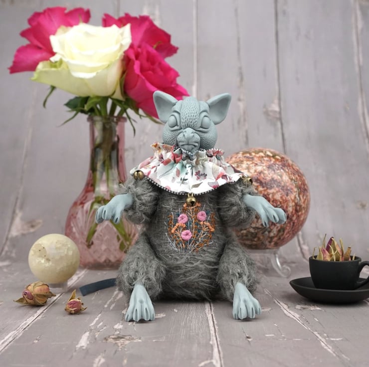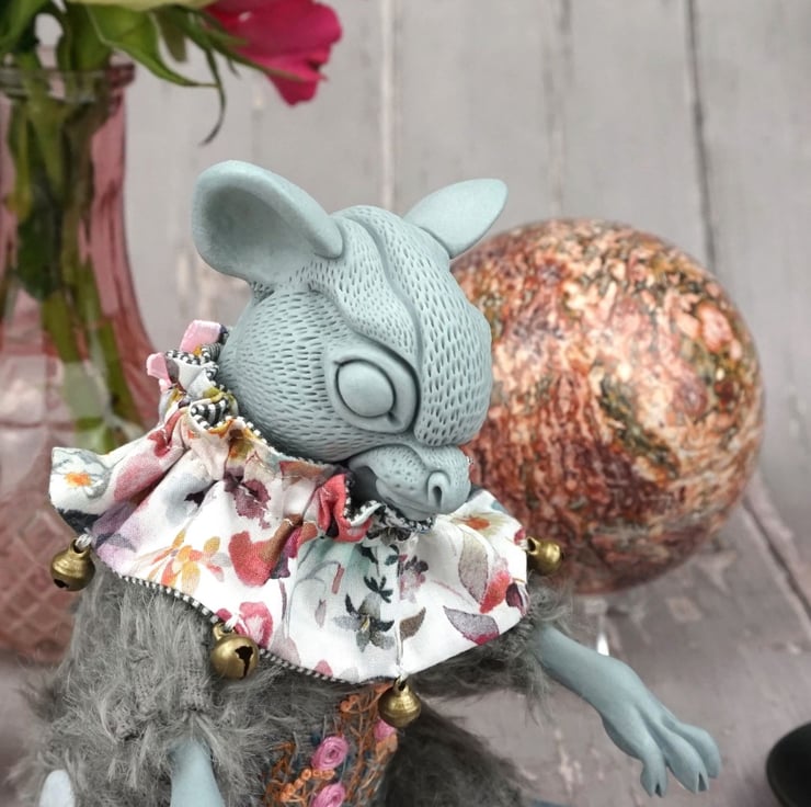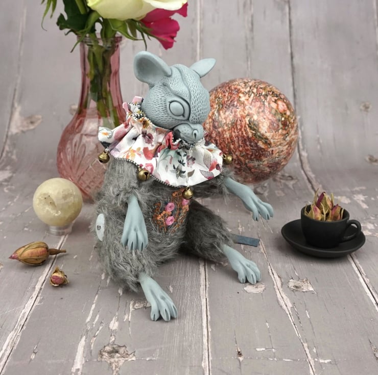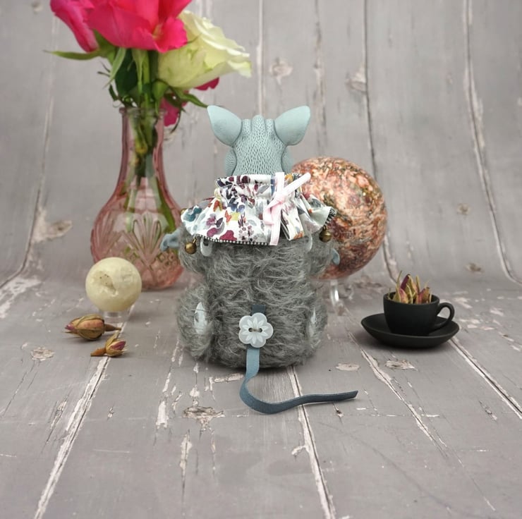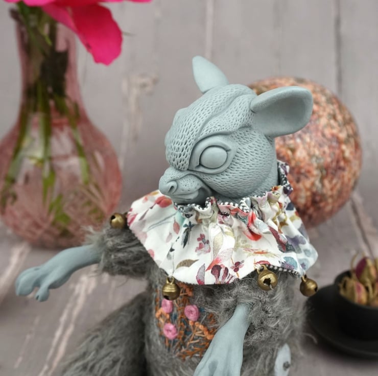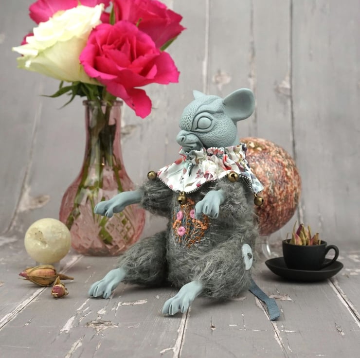 A grey day means cut flowers ought to stand on the parlour table, thinks Marcel, who is a grey mouse with a flowery spread of hand embroidered roses on his navel. Around his neck, Marcel displays a collar fashioned from a liberty floral print adorned with bronze bells. Like his paws, Marcel’s head is a grey-stained porcelain that has been hand detailed with fur. His body is a light-ash mohair and his tail grey leather. Marcel is weighted and made to be seated, however his limbs move at hip and shoulder. At the centre of his chest is a Quartz crystal. This stone is like glass, says Marcel, and is open to all colour.