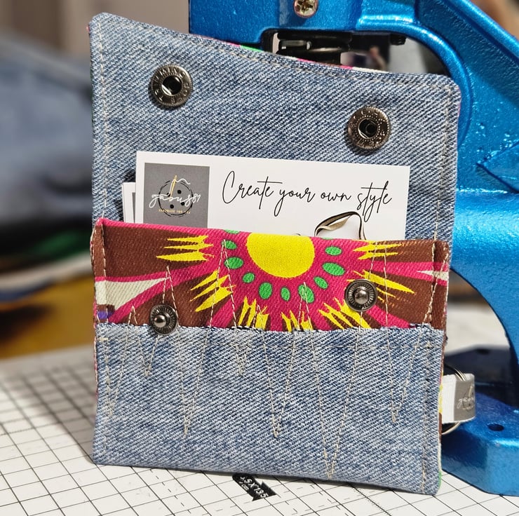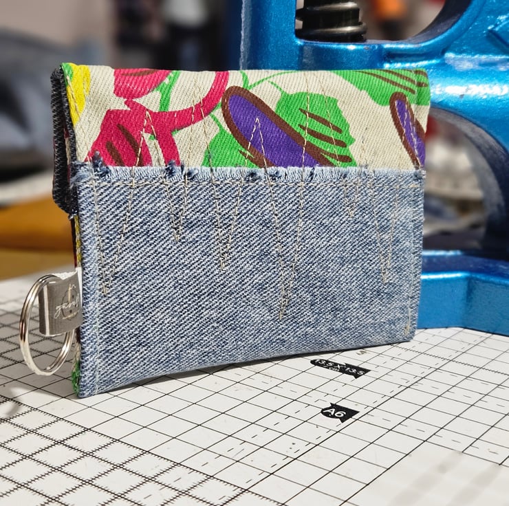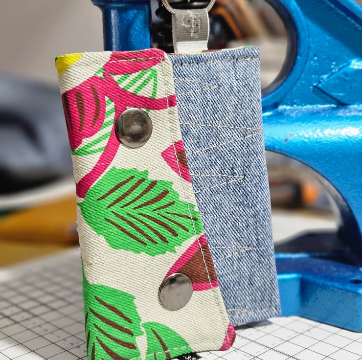 The vibrant fabric detail adds a fun touch to the durable repurposed denim. It also has a secure snap closure to keep everything in place.