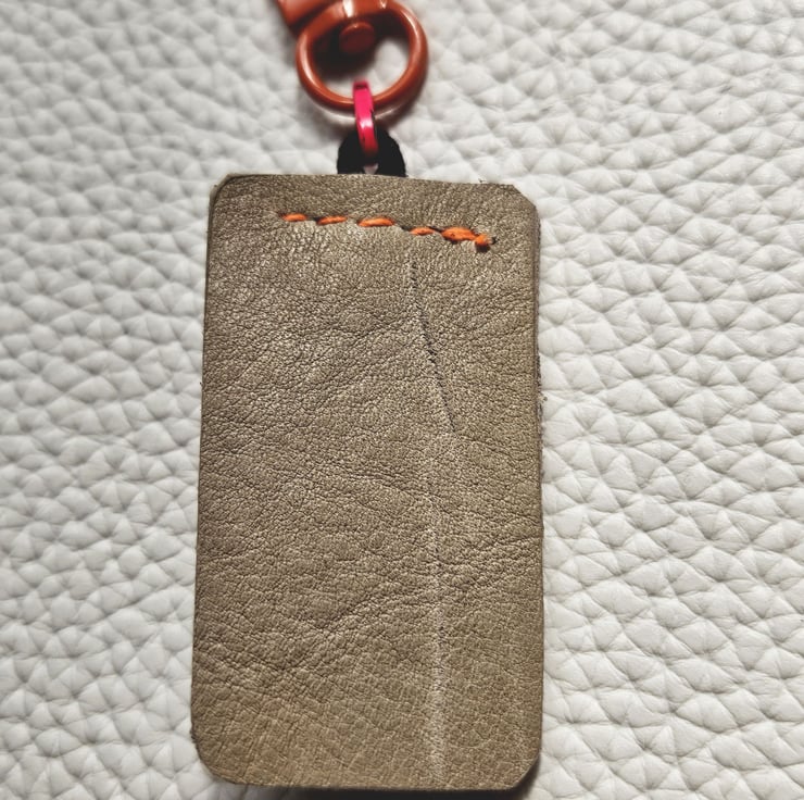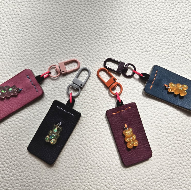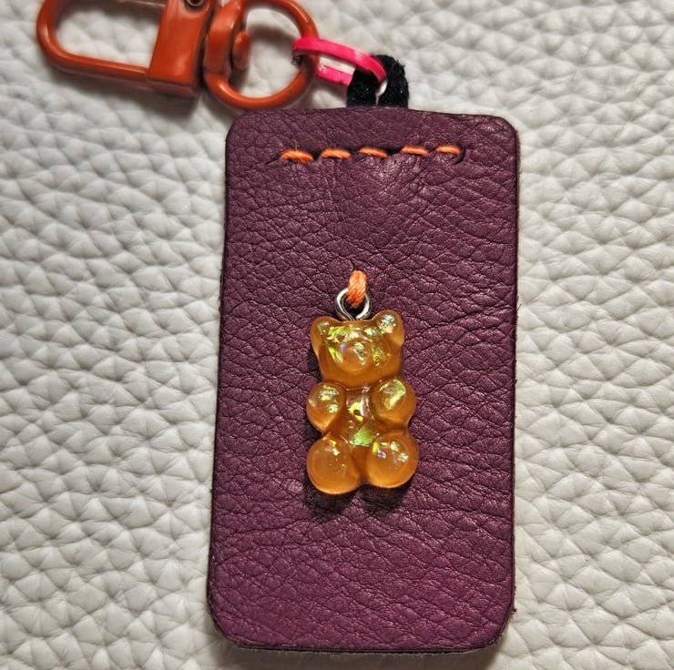 Purple and contrasting orange gummy,-bear detail. This cute leather keyring is a great gift for both adults and children alike!