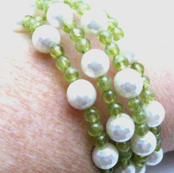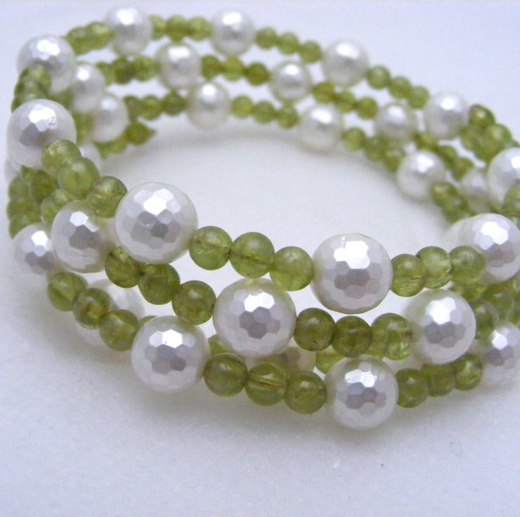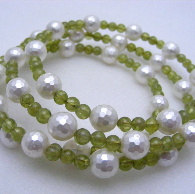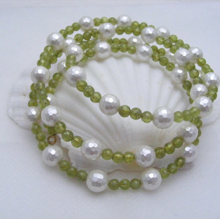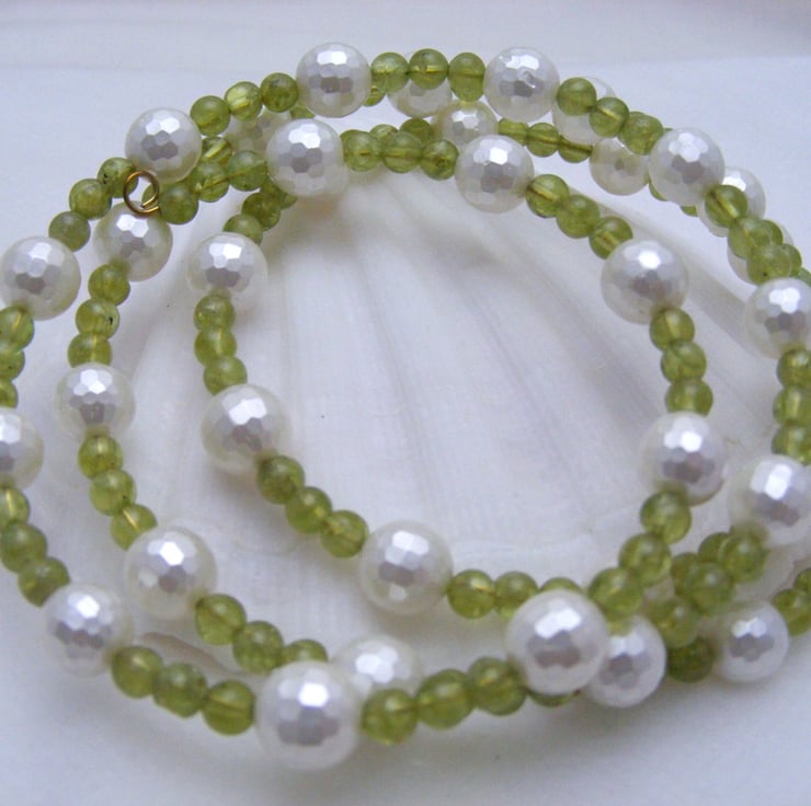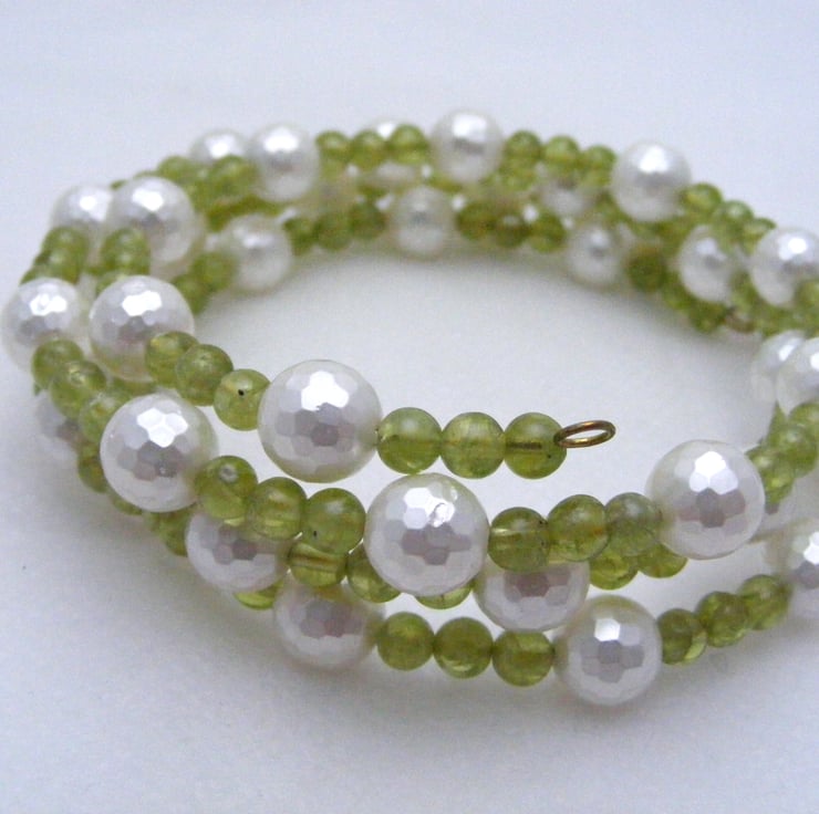 Bangle is handmade with, 3 coils of gold plated memory wire and I've threaded on 8mm faceted white shell beads and 4mm peridot gemstone rounds. Wire ends are looped.
