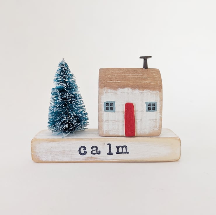 On a hand stamped wooden base, add your teeny painted house and tree.