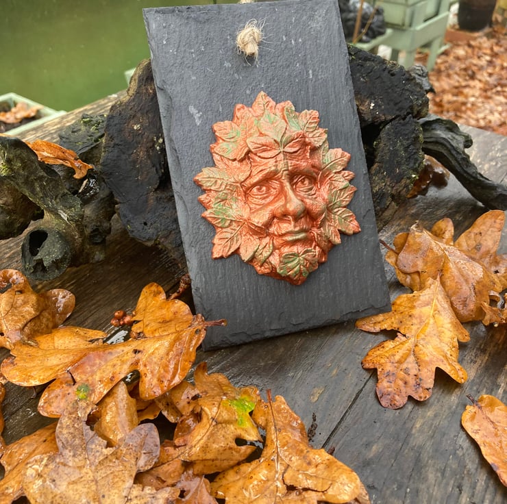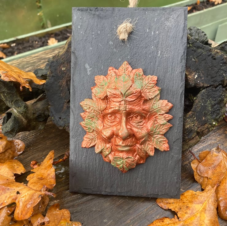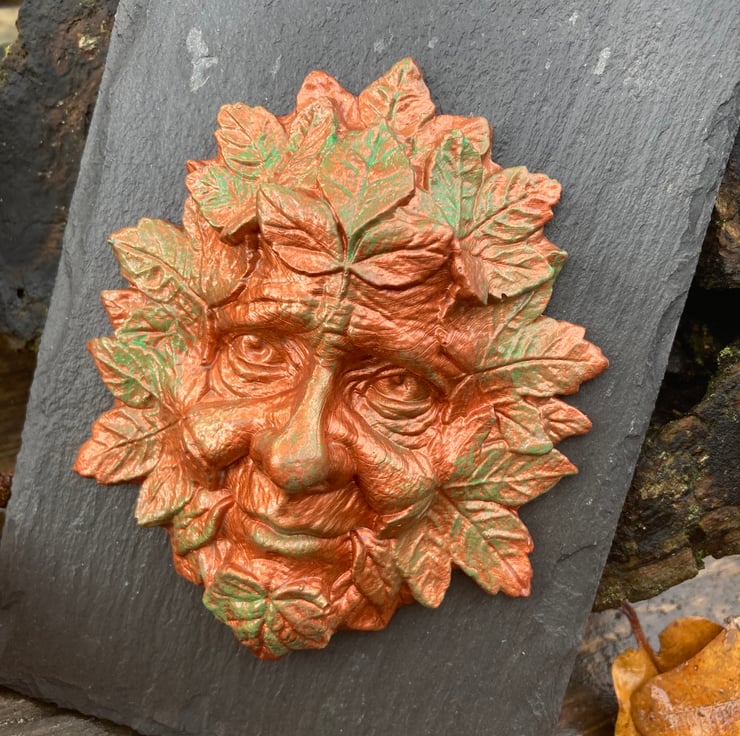 The traditional Green Man, pagan symbol of new life, rebirth, fertility (not mandatory!) and all good things. This is cast in jesmonite and mounted on reclaimed roof slate and is suitable for outdoor hanging. A lovely addition to your garden or home. Measures approx 17cm x 10cm, although there is slight variation due to nature of the product. Colour can also vary slightly and we do produce them in different shades of greens and also in copper and bronze, so please contact us if you’d like something different. If the particular item you like has been sold, I will email you other options and colours or make it to your order. I will NOT disappoint you!