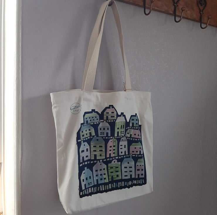 My original paper collage design of imaginary pastel houses is printed on one side, with my logo.