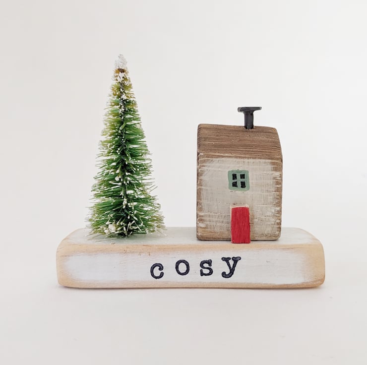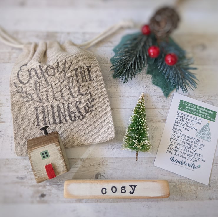 A teeny festive wooden house scene in a bag, that you can personalise with your own decoration!