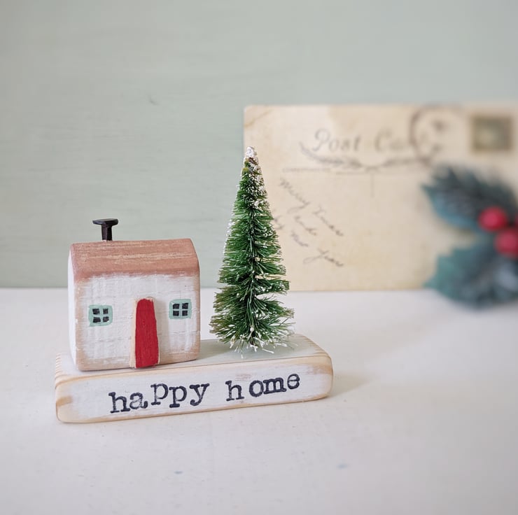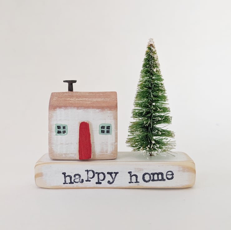 On a hand stamped wooden base, add your teeny painted house and tree.