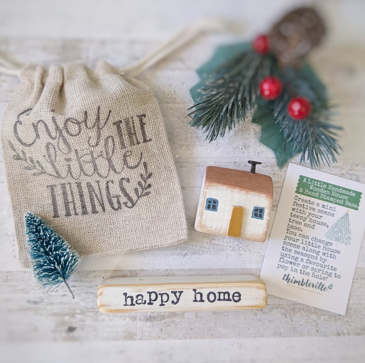 A teeny wooden house scene in a bag, that you can personalise with your own decoration!