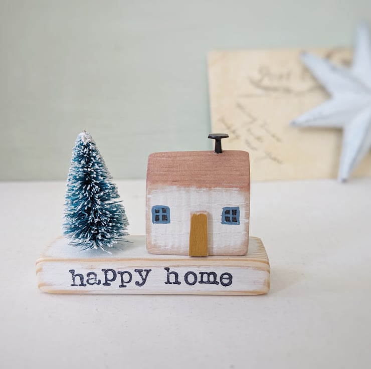 On a hand stamped wooden base, add your teeny painted house and tree.