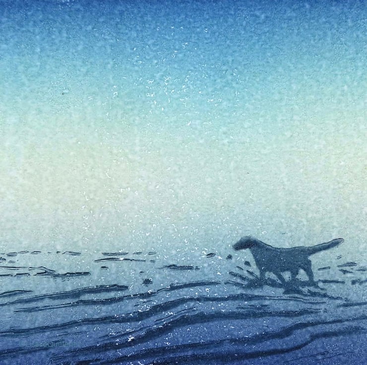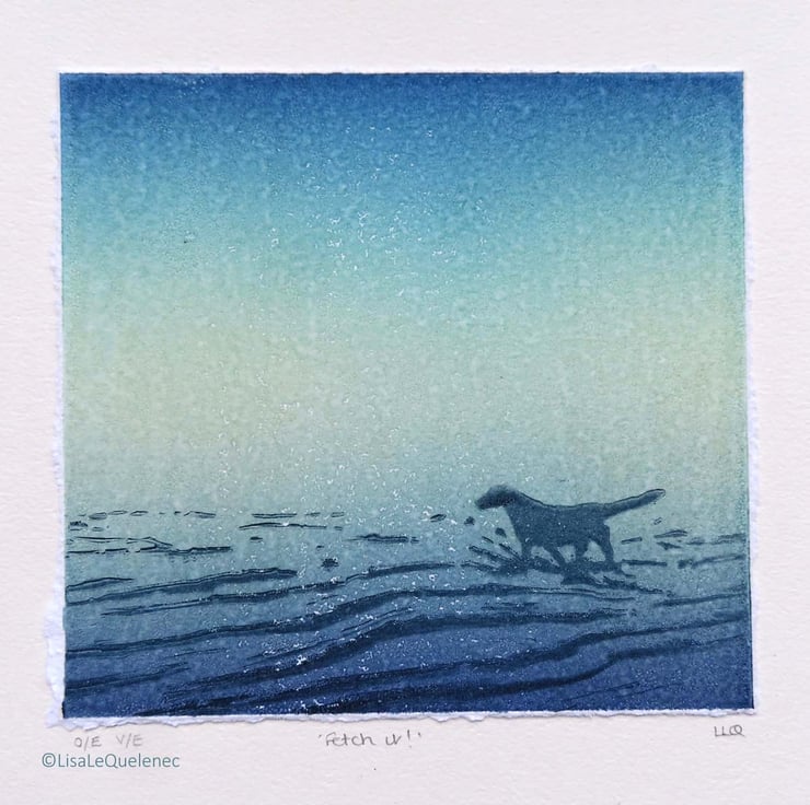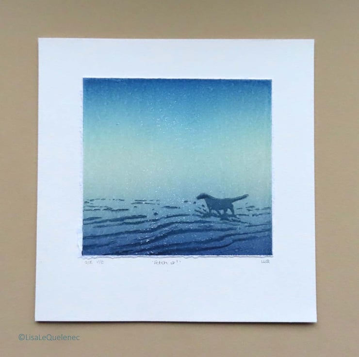 Original lino print of a dog fetching his ball and splashing at the waters edge. This is an open edition, varied print. Other pieces from the series are available in my store that are varied in colour.