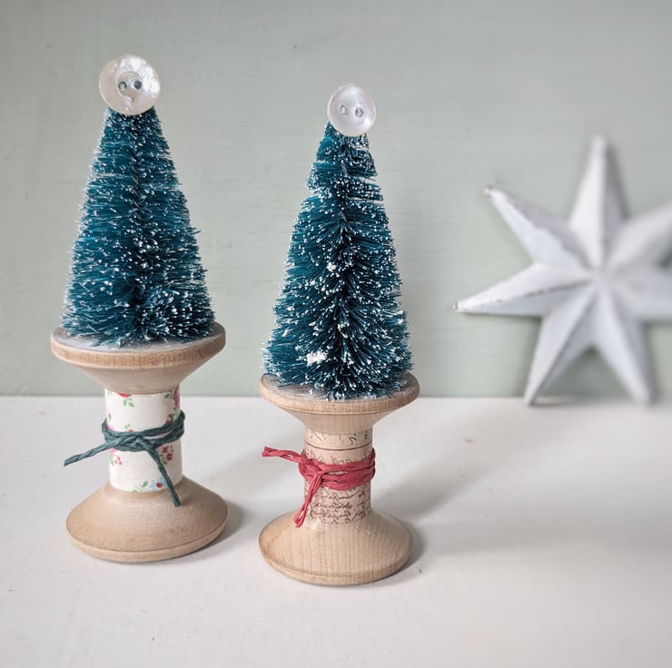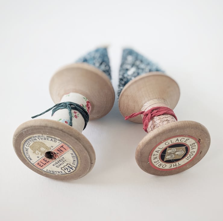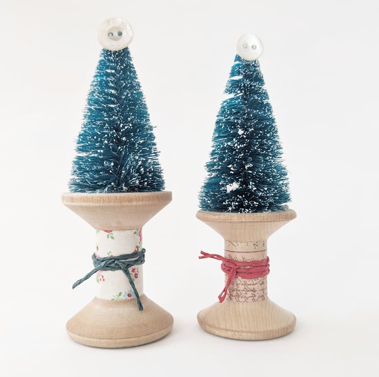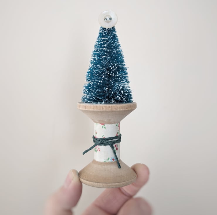 A little Festive tree sits atop a worn vintage wooden bobbin with a teeny mother of pearl button for a star!