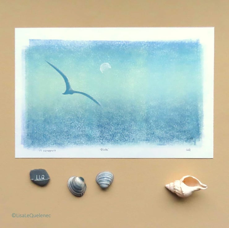 This is a print and mixed media piece depicting the moon rising over the sea with a lone gull gliding.