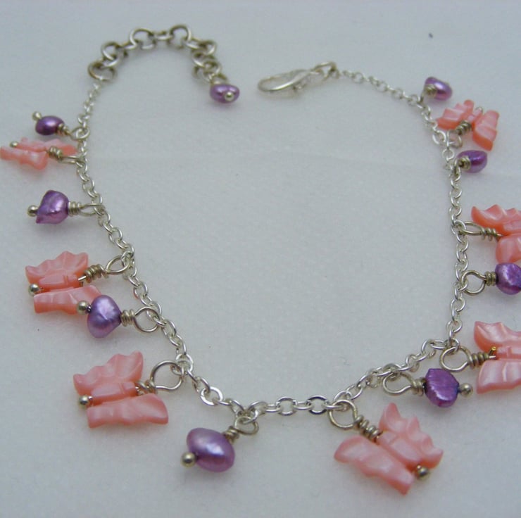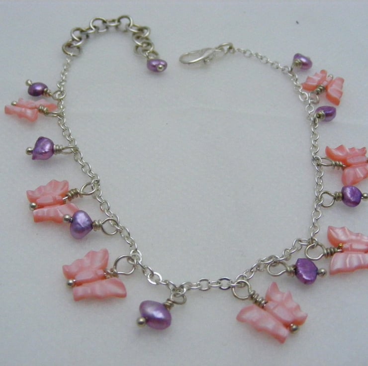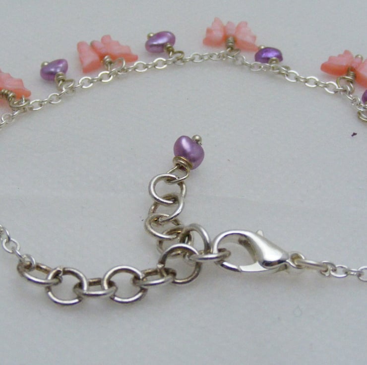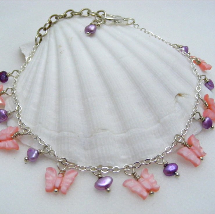 Anklet is handmade with, 10x12mm coral mother of pearl butterfly beads, 4-5mm purple freshwater pearls and silver plated findings.
