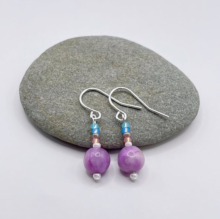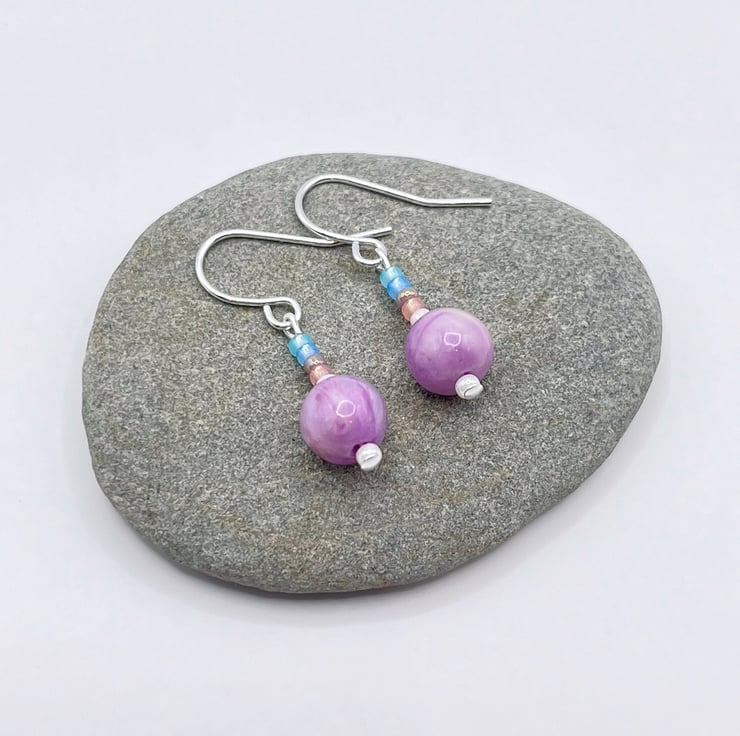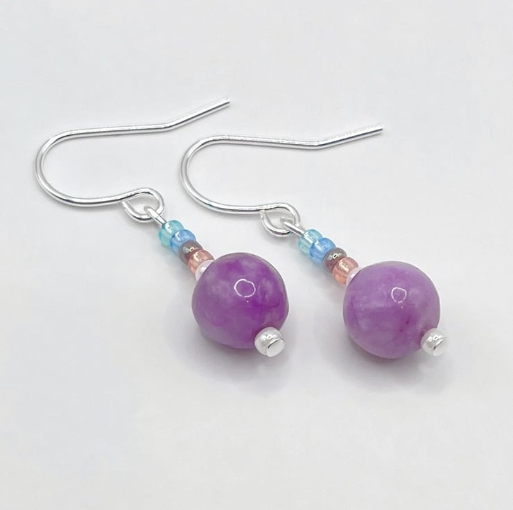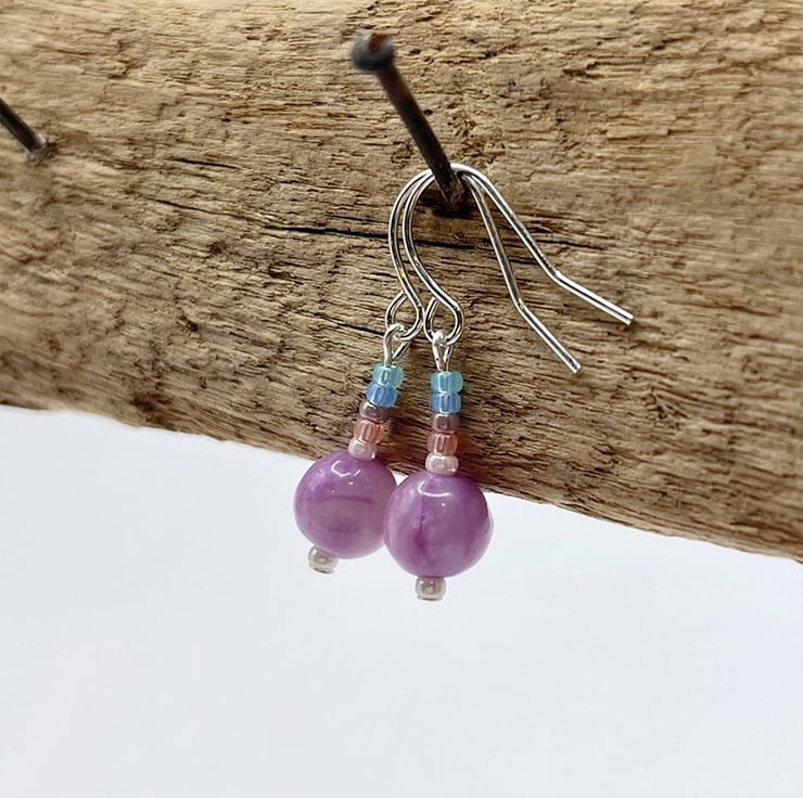 Pretty little round Lilac Jasper bead drop earrings with a pastel mix of glass seed beads on a choice of either silver plated or sterling silver ear wires.