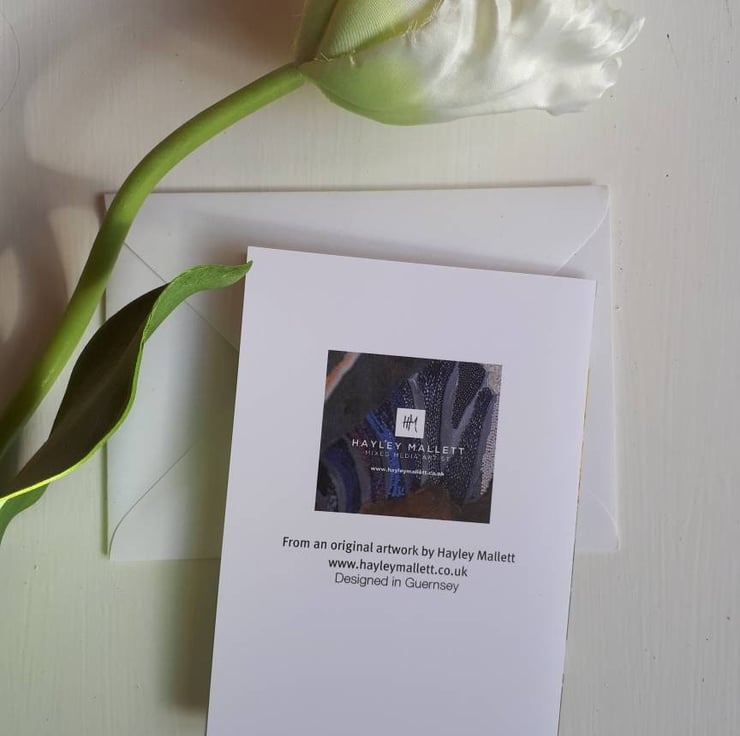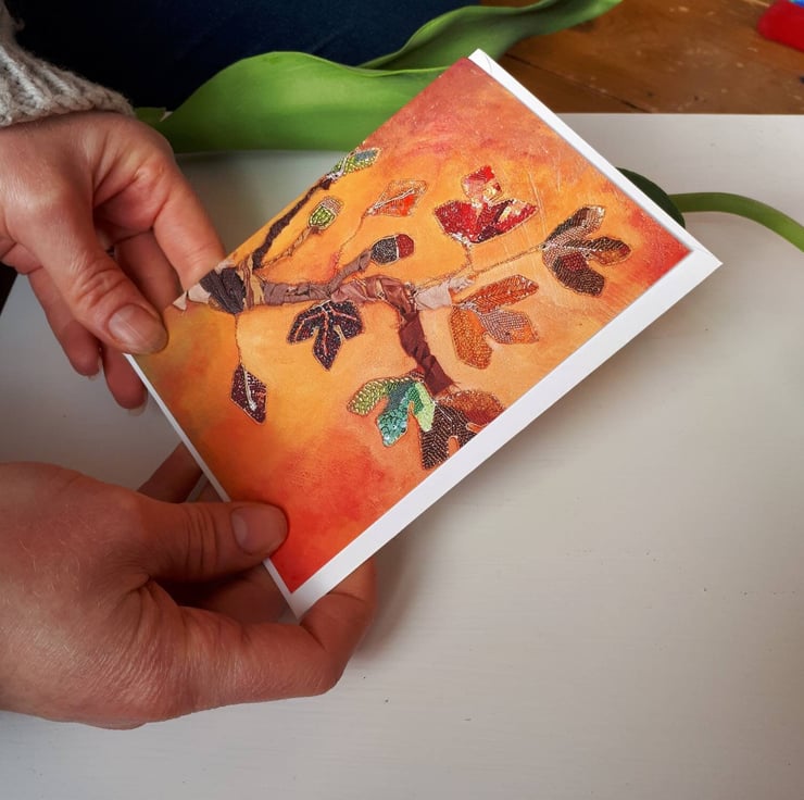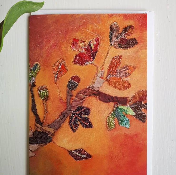 The 'Autumn Leaves 2' piece that inspired this card was created using acrylic paints on canvas, embellished with hand-beaded details, sequins, and 3D wire elements. It took over 200 hours of meticulous work to complete. If you're interested in owning a Limited Edition print of this design, feel free to get in touch.