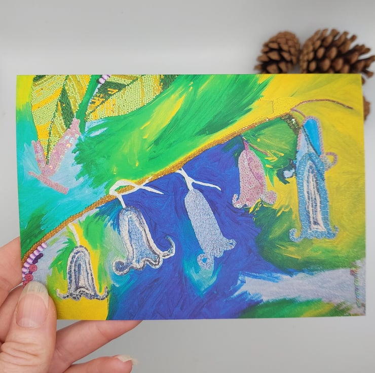 The original artwork is entitled 'Bluebells'and was painted on canvas in acrylic and then hand beaded and stitched on top. It took over 200 hours to complete. The original is still available, as are A5 prints, please get in touch if you'd like details.