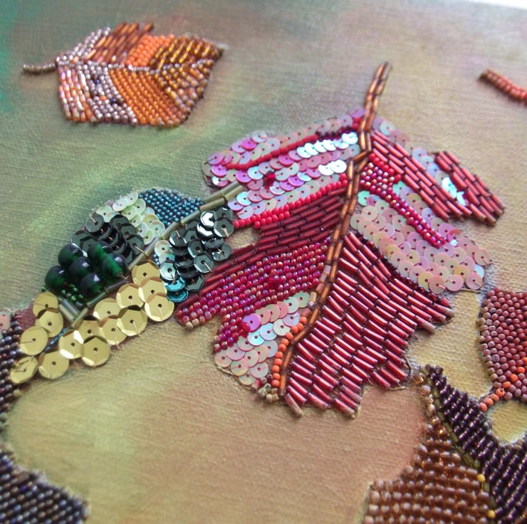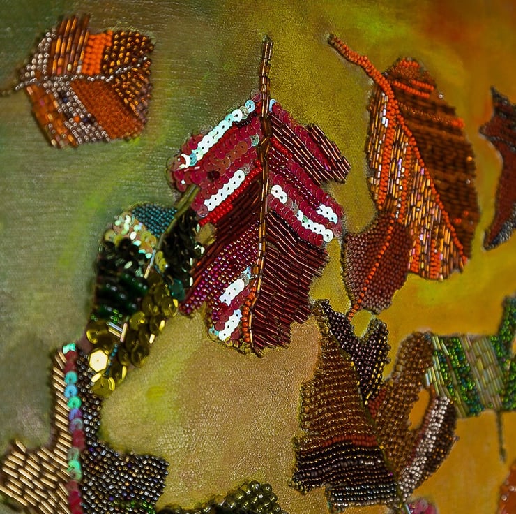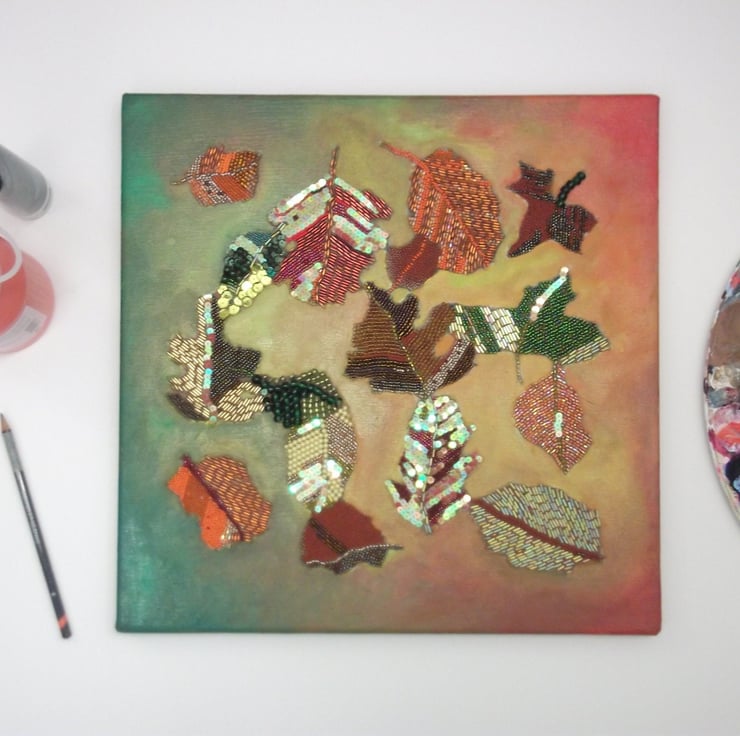 This unique mixed media painting, titled Autumn 1, is an original creation on canvas. The artwork features a vibrant acrylic painting that has been enhanced with hand-applied beads, creating a striking 3D texture that brings the scene to life.