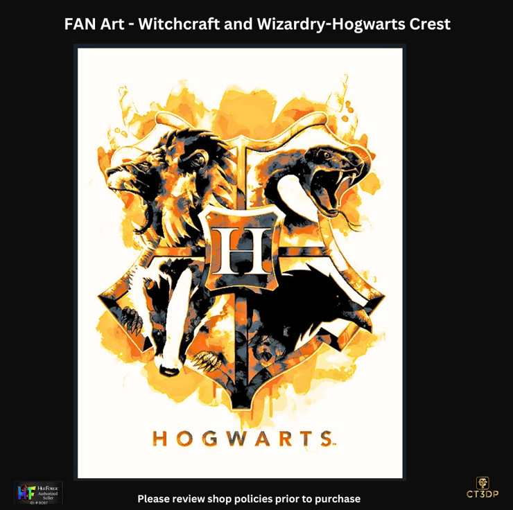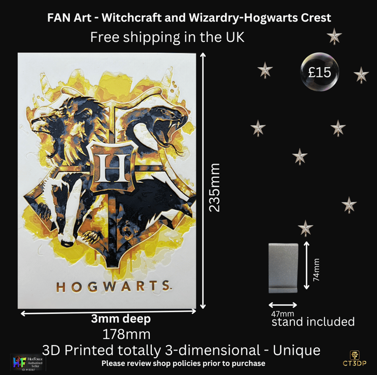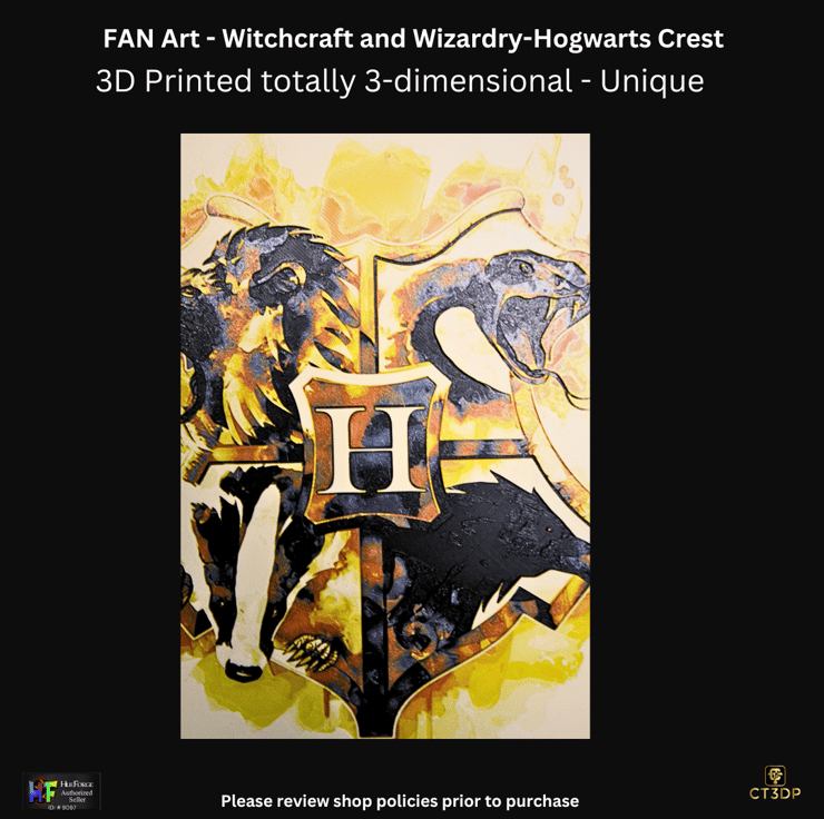 A 235mm x 177mm x 3mm 3D printed 'painting' of the Hogwarts crest.