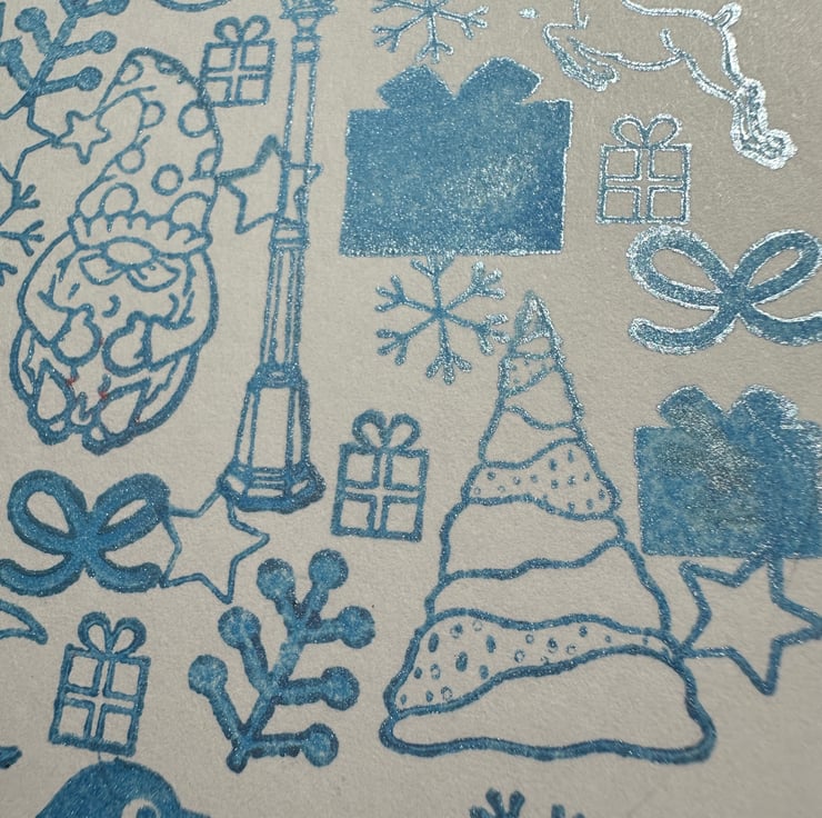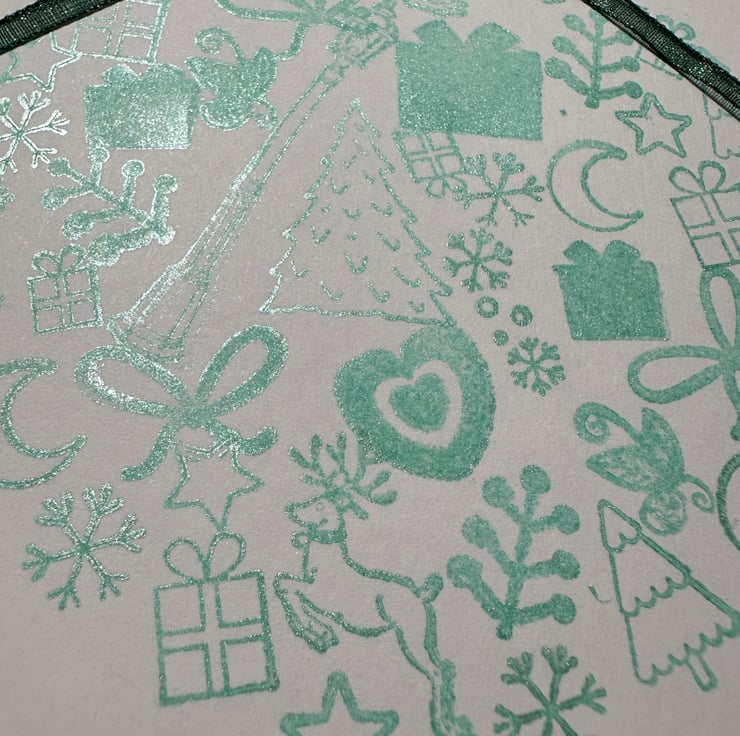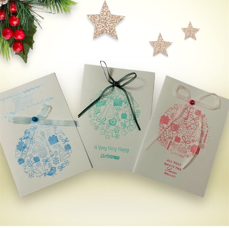 A stunning set of 2 cards of different coloured baubles, each overflowing with a host of different tiny Christmas images all individually hand stamped onto heavy card stock.