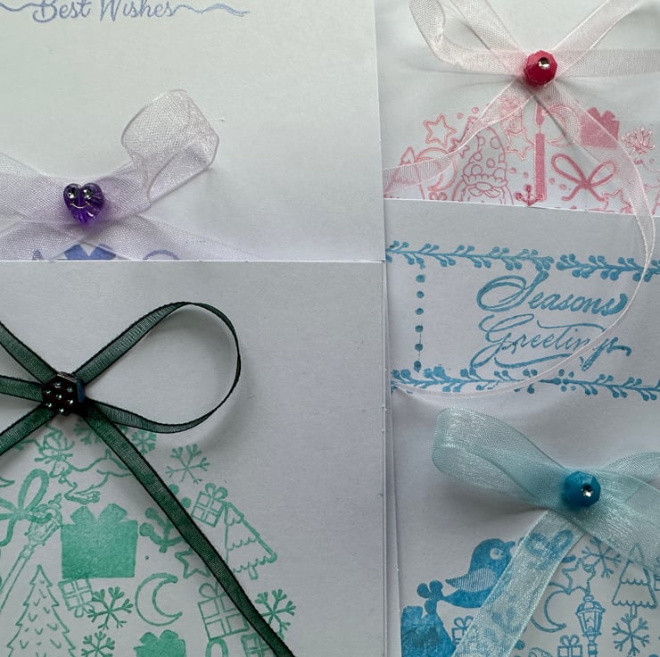 Each is stamped “homemade” in the matching shimmery ink on the back and the inside has the luxury of an insert leaf in a thick plain white paper which has been left blank for your own message.