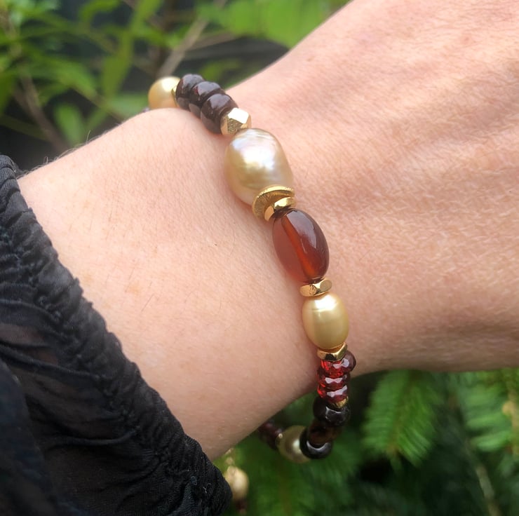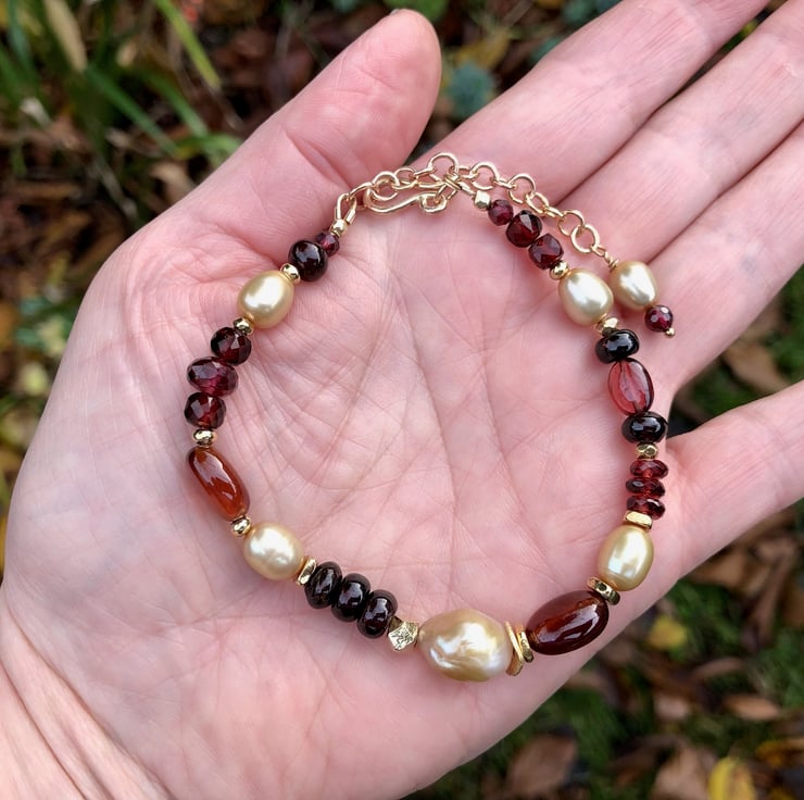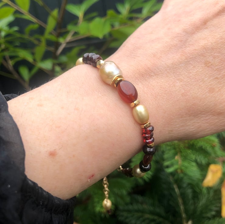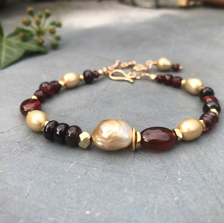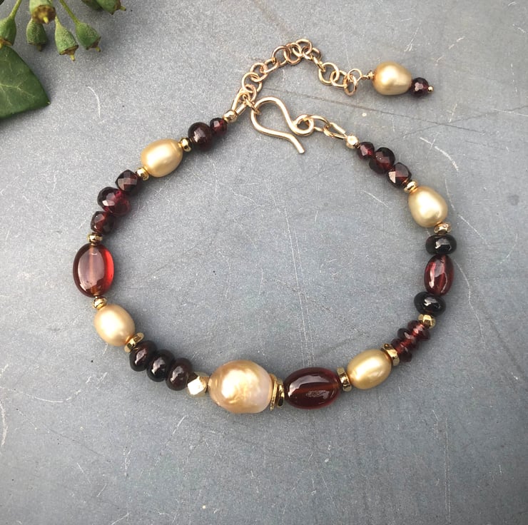 One-of-a-kind luxurious beaded bracelet with AAA quality Garnet gemstone beads, a lustrous light gold Baroque Edison Pearl, light gold freshwater Pearls and little Gold Vermeil beads. The bracelet is finished with a handmade 14K hook clasp and a handmade 14K Gold Filled extender chain, both of which I have soldered with gold solder.