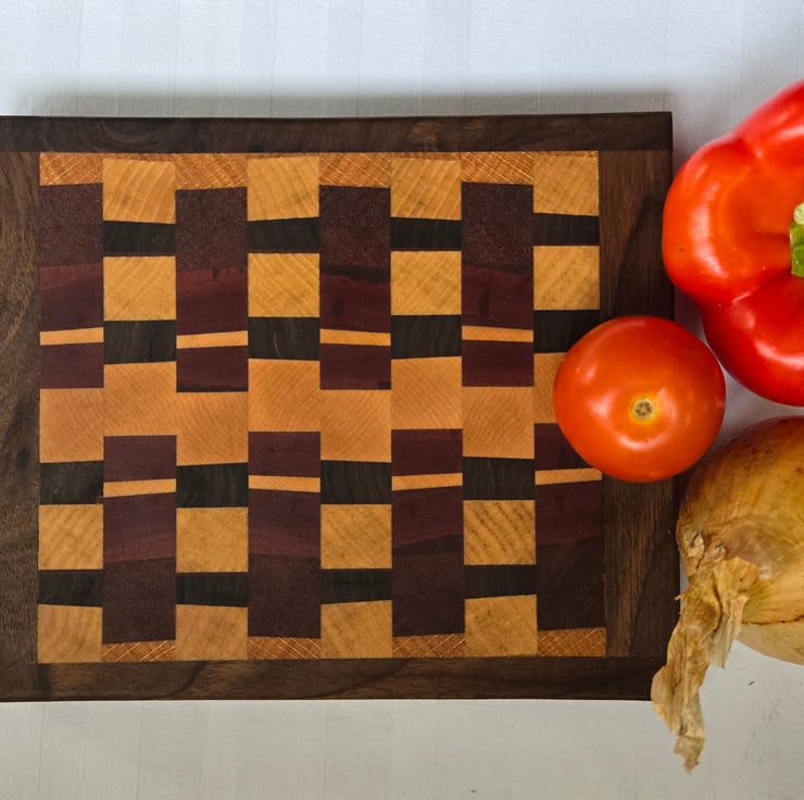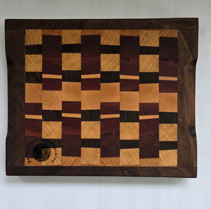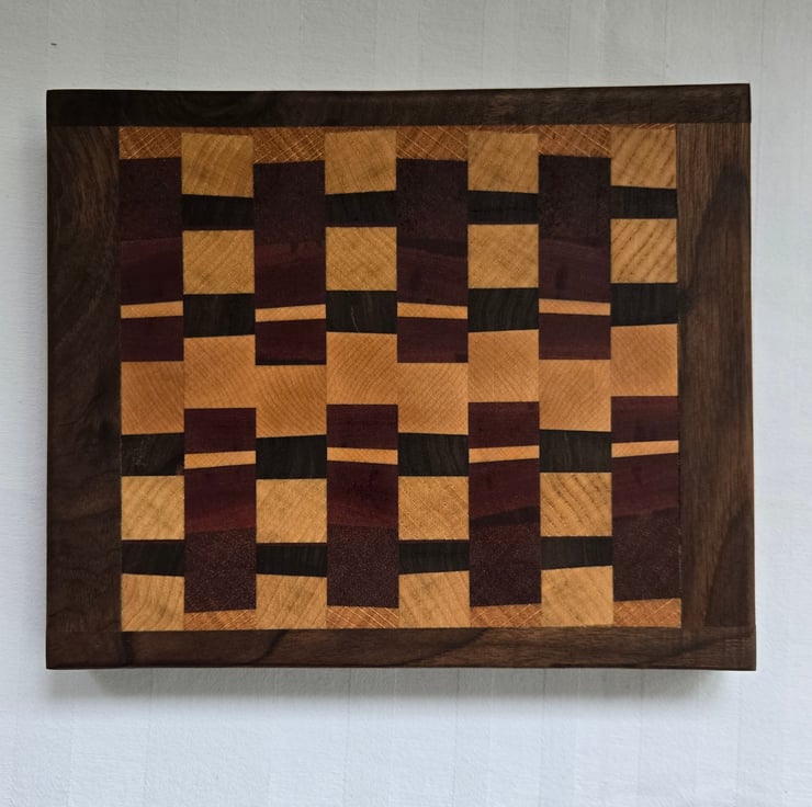 A handmade,patterned, end of grain chopping board, made using Cherry,Maple, Walnut, and Oak. A completely unique and "one of a kind" board measuring 22.4 cm x 18.5 cm x 3 cm, and finished using a food safe oil. Suitable for all kitchen prep. A"handle" has also been cut into each end for ease of moving.