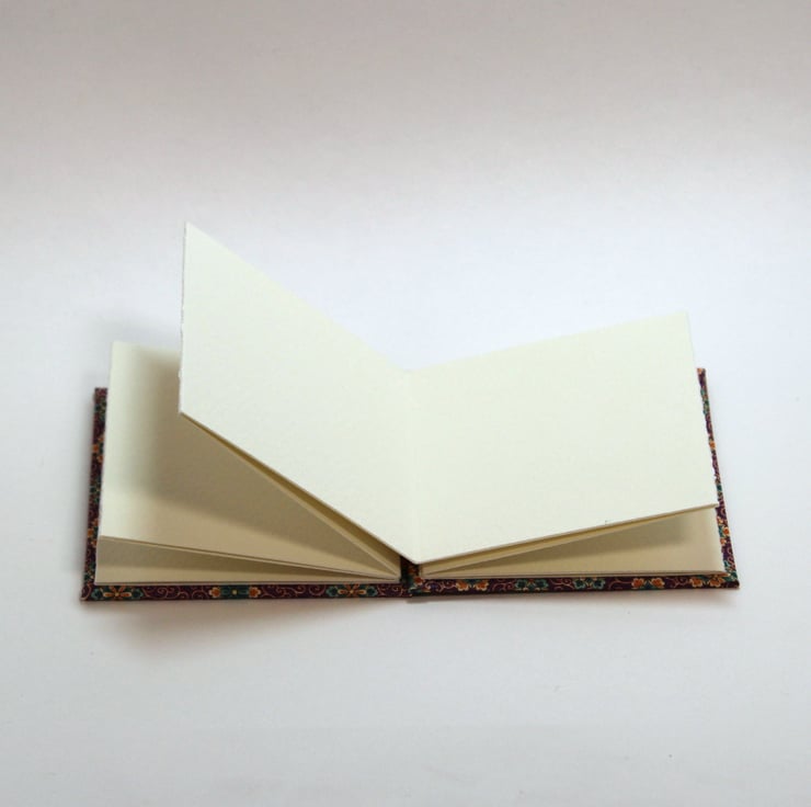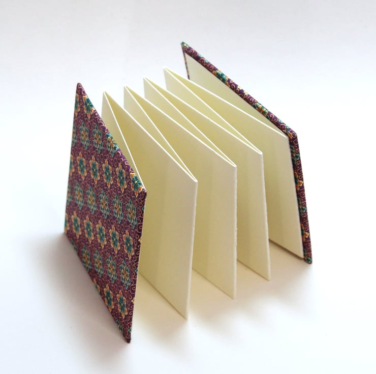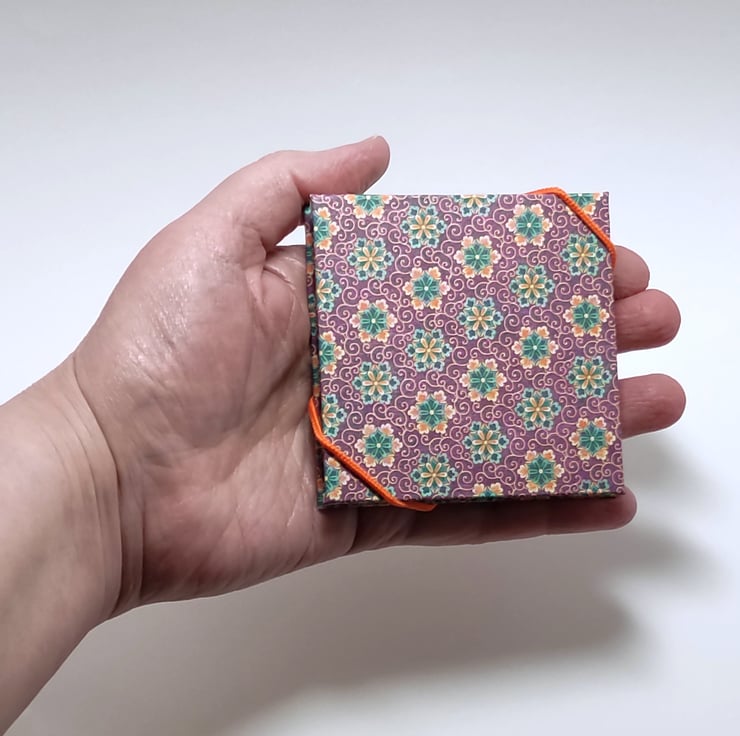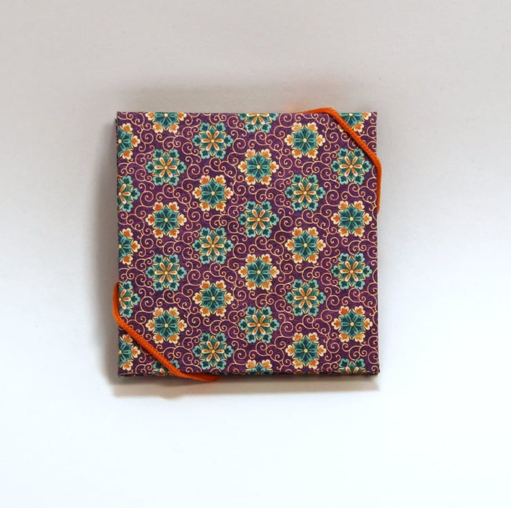 This is a small, watercolour sketchbook for artists that has been handmade by me. It is ideal for travelling (as the papers won't fall out during painting) but can also be used as a mini journal. It has purple, orange and teal floral patterned covers with concertina style, 100% cotton rag watercolour paper and orange elastic closure. Just over 7.5cm square (3" square) in size and just over 1cm deep with 16 sides to paint on (not including the two end papers).
