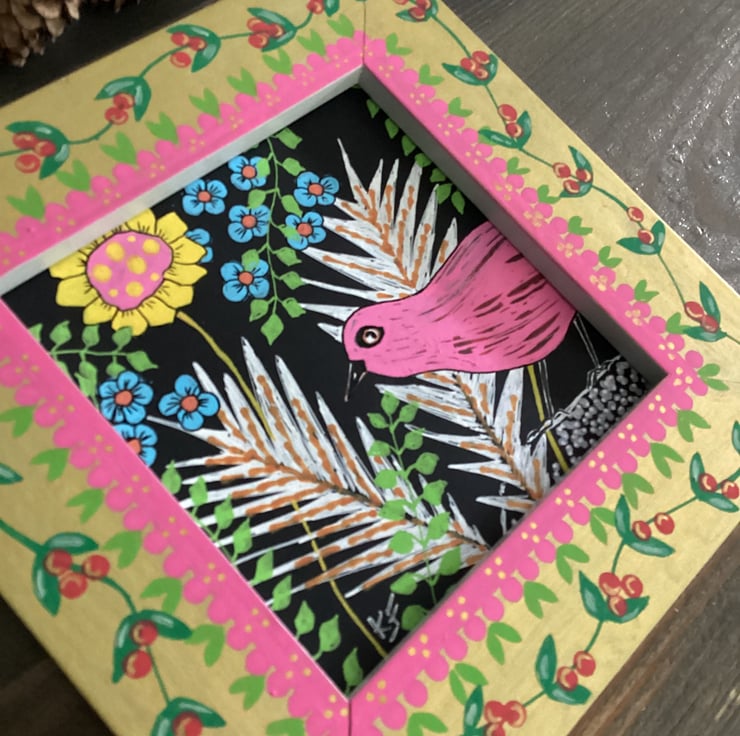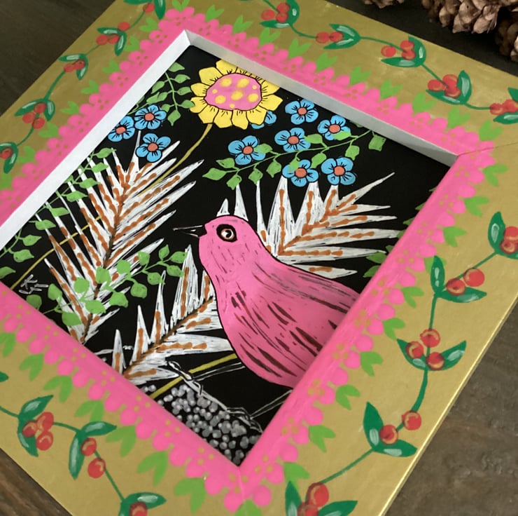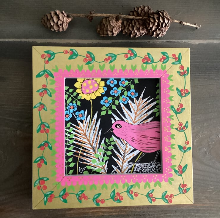 I have hand painted the frame with a folk arty feel and this enhances this artwork with its complimentary colours.