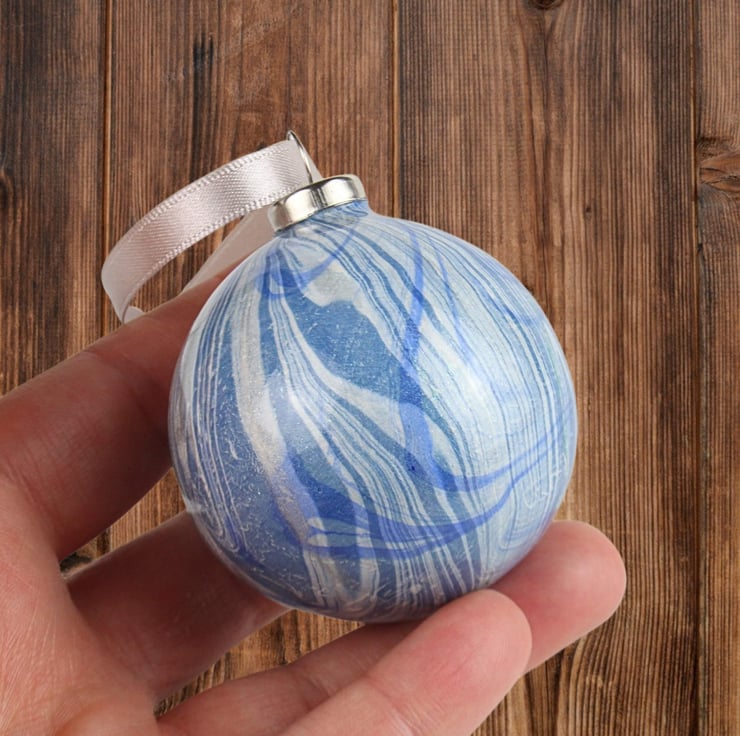 The baubles in this range are marbled directly onto the ceramic surface - a technique which is much more difficult than it sounds! Each bauble is marbled from a different bath, so they are all different and totally unique. They are lots of fun to make and totally addictive!