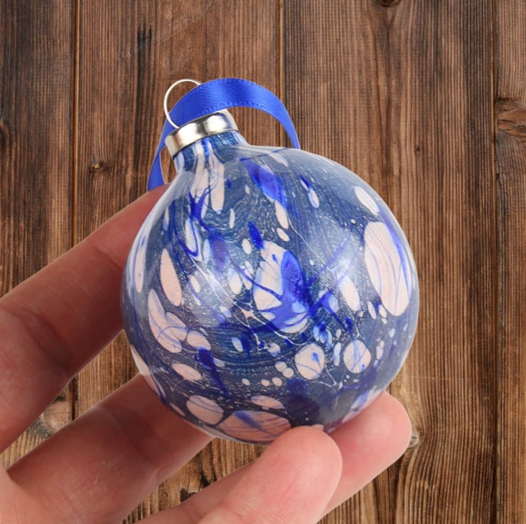The baubles in this range are marbled directly onto the ceramic surface - a technique which is much more difficult than it sounds! Each bauble is marbled from a different bath, so they are all different and totally unique. They are lots of fun to make and totally addictive!
