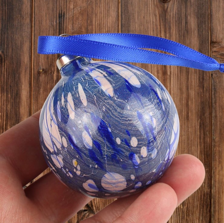 Ceramic bauble marbled with pale Prussian blue, royal blue and pale copper with a subtle green sparkle.