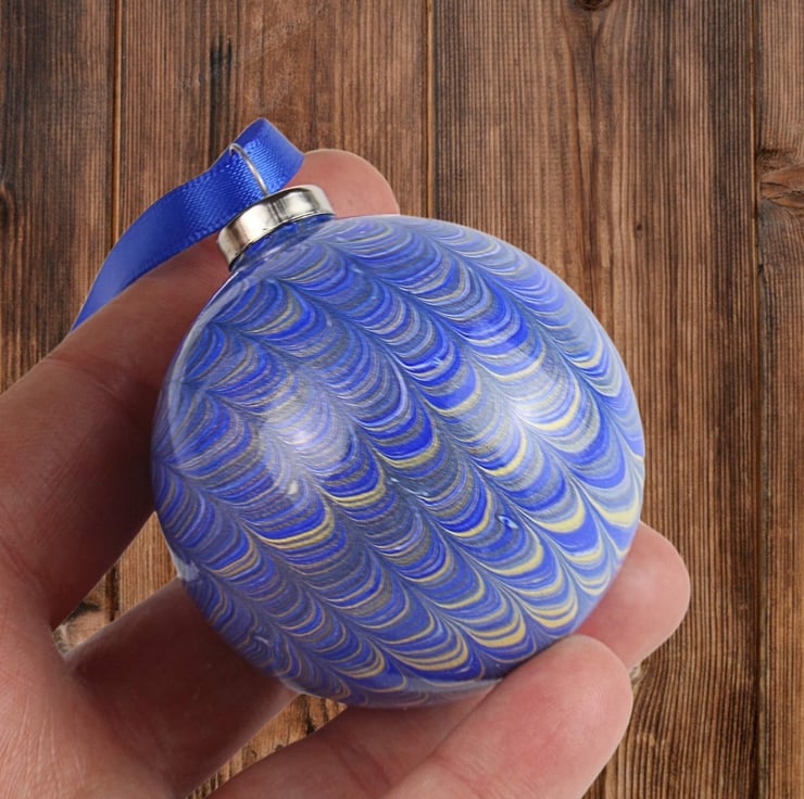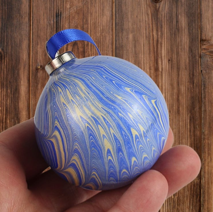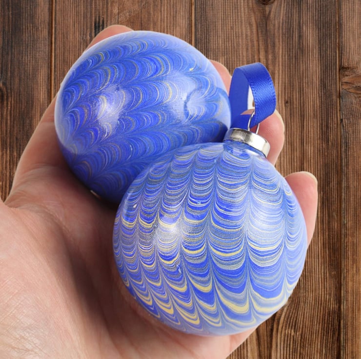 The baubles in this range are marbled directly onto the ceramic surface - a technique which is much more difficult than it sounds! Each bauble is marbled from a different bath, so they are all different and totally unique. They are lots of fun to make and totally addictive!