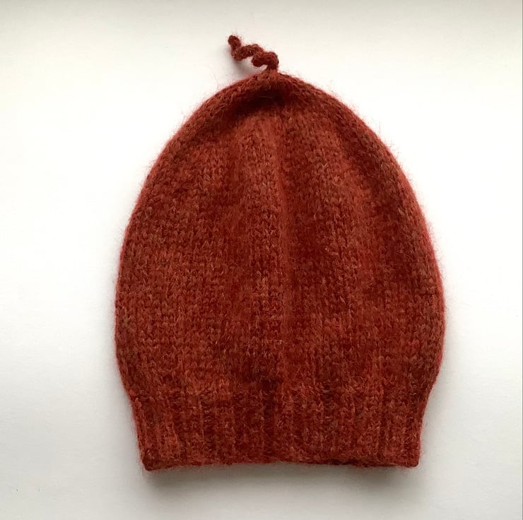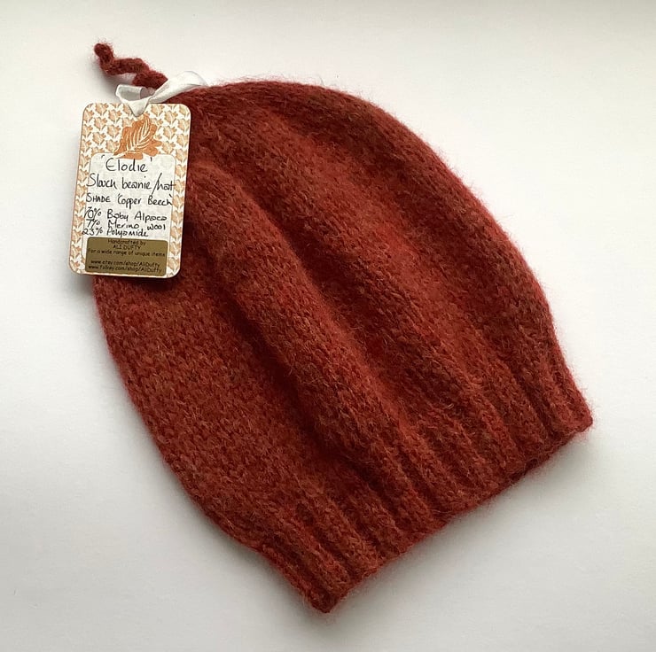 I have designed and knitted this slouch beanie / slouch hat 'Elodie' in a delightfully soft, baby alpaca / Merino wool blend yarn . I've also added a cute little corkscrew curl to the top ! Very lightweight but super-cosy.