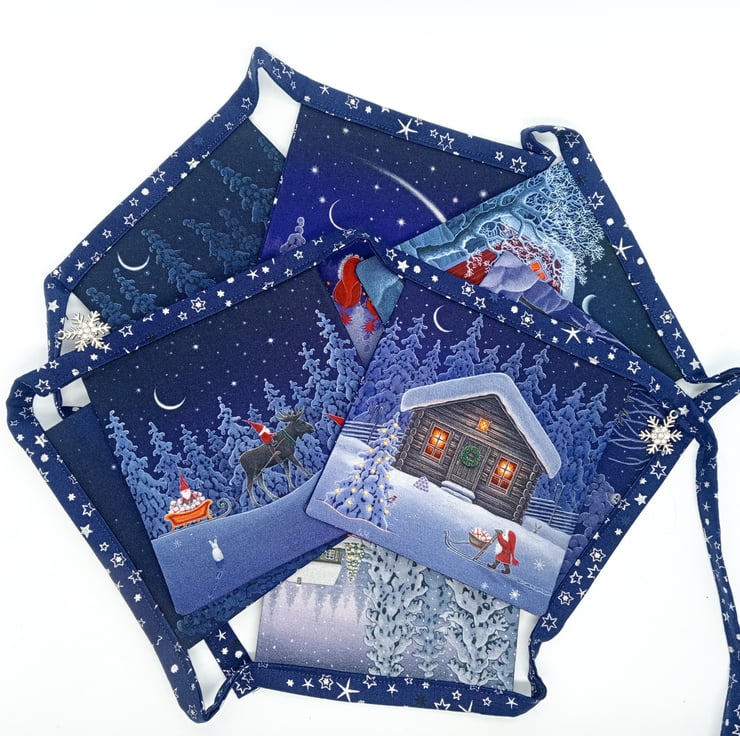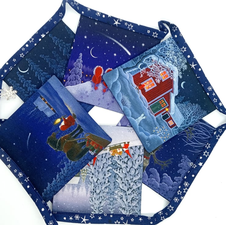 This lovely larger bunting is 1.5m long with 30cm ties, and has 8 flags measuring 12cm x 12cm and features a collection of gorgeous Christmas pictures