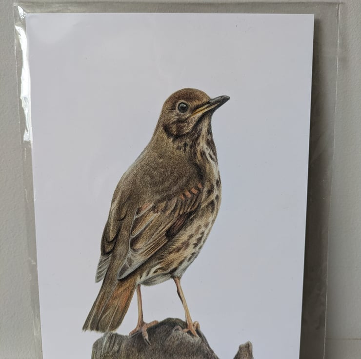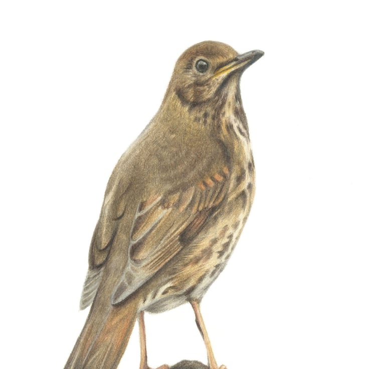 An A5 print from an original coloured pencil drawing of a Song Thrush