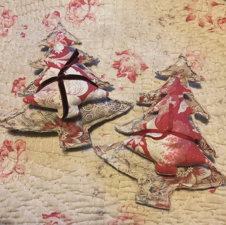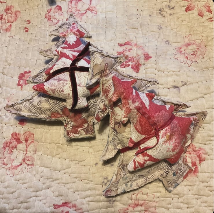 These gorgeous bundle pairs, comprise of two sized Christmas trees stacked together. The larger one is made from a very old worn antique quilt - this most definitely is not perfect, but is so textural in appearance because of it, with the raw edges also adding to the textural appearance.