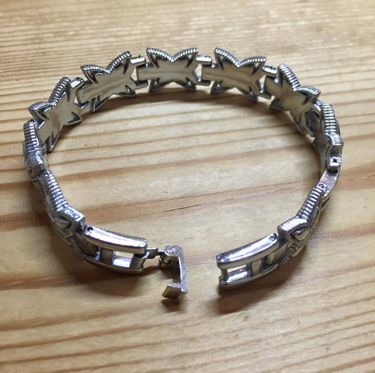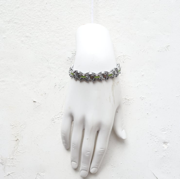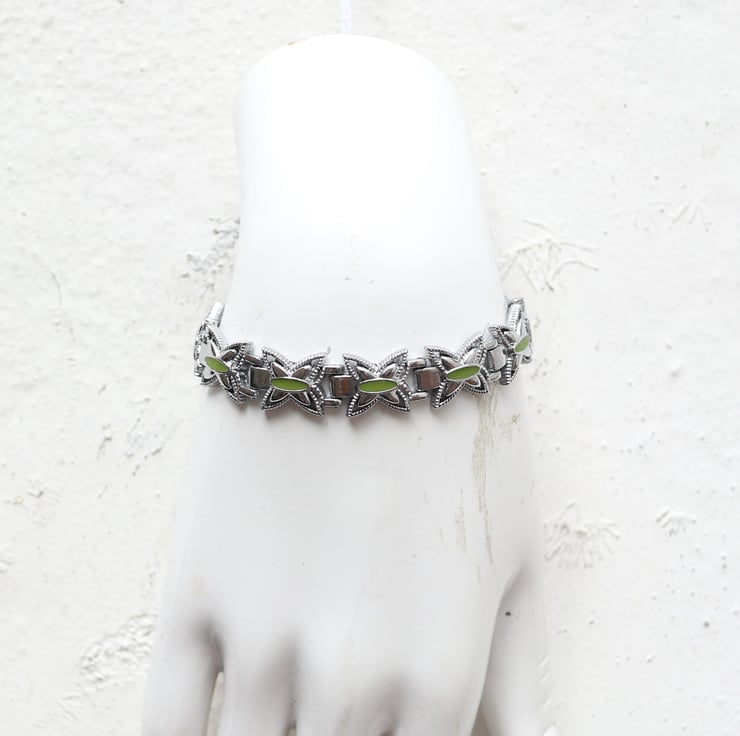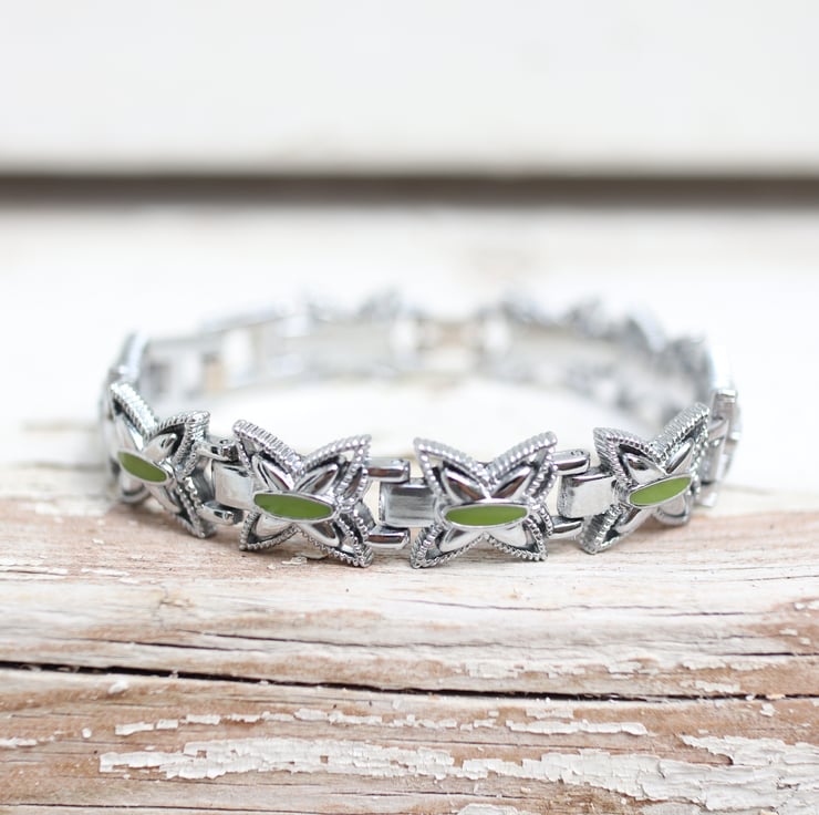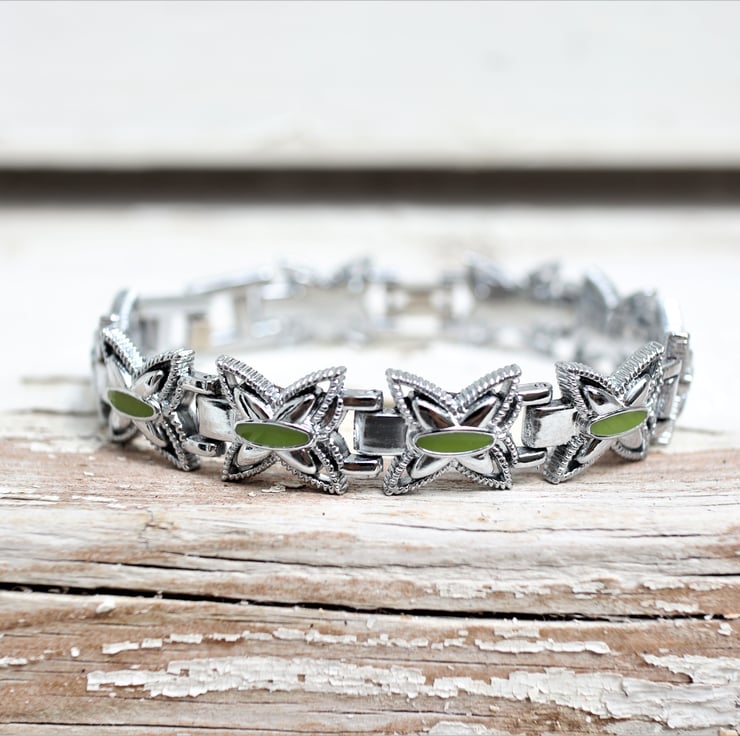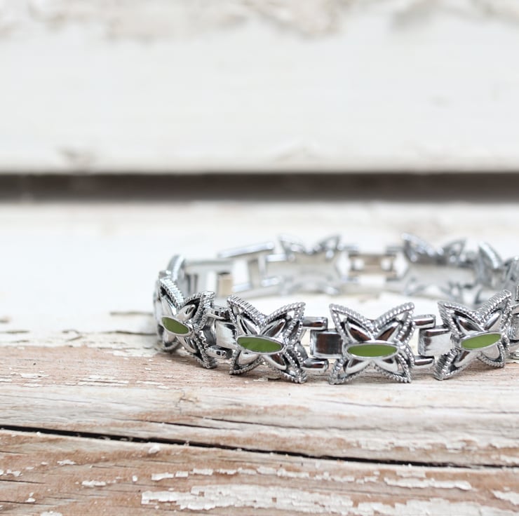 Pretty Upcycled Apple Green Star Flowers Stainless Steel Watch Parts Handmade Bracelet - Vintage Gift