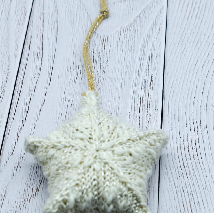 This is a lovely little star, knitted in a textured white yarn and stuffed with toy grade wool stuffing which conforms to EN71, BS1425, BS5852. The star is finished with brown and silver cotton twine to hang.