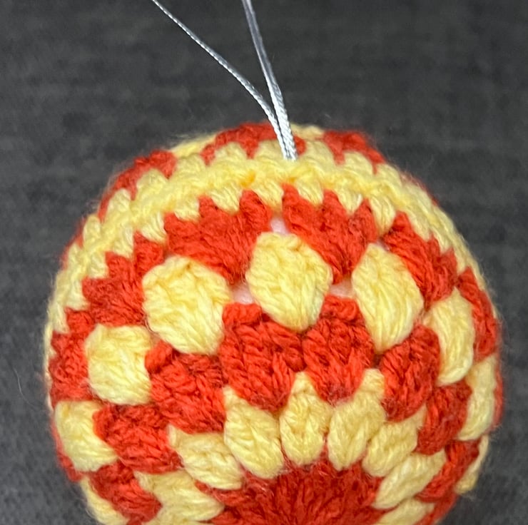 It has a dark orange and yellow stitch covering a polystyrene ball.