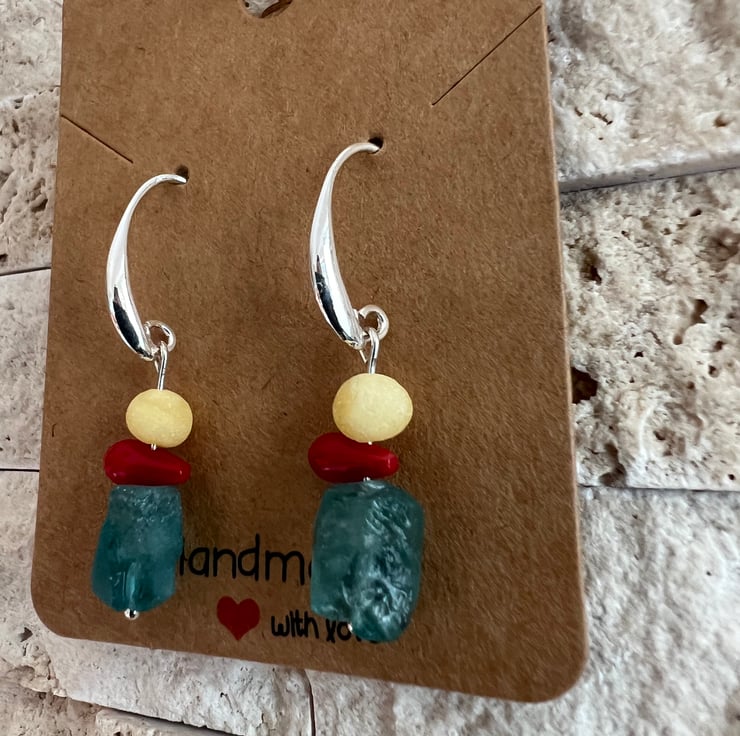 These sterling silver drop earrings showcase a striking mix of raw amber,raw apatite and red coral.The warm golden tones of amber contrast beautifully with the cool earthy blue-green of apatite and the vibrant pop of red coral,creating a bold yet natural look.