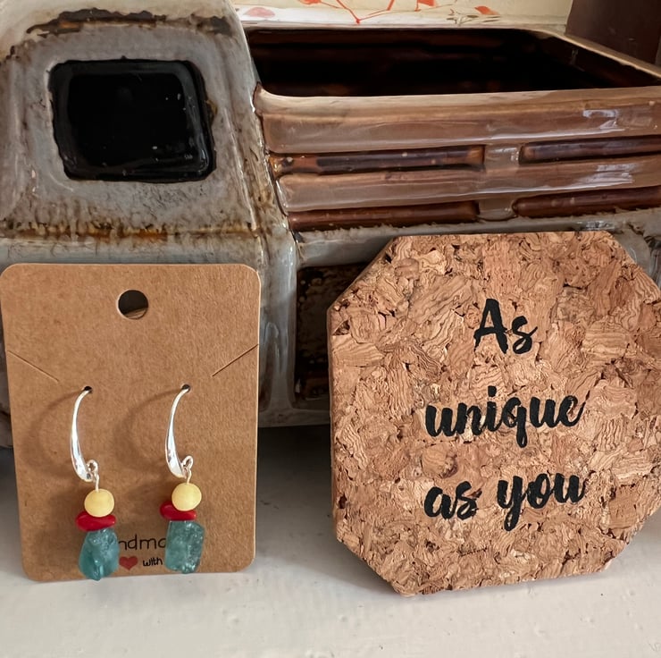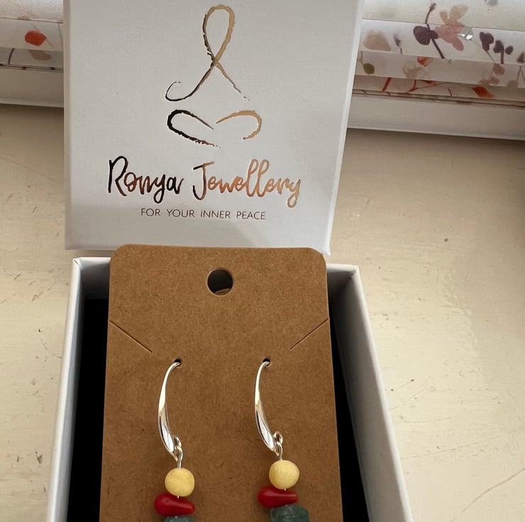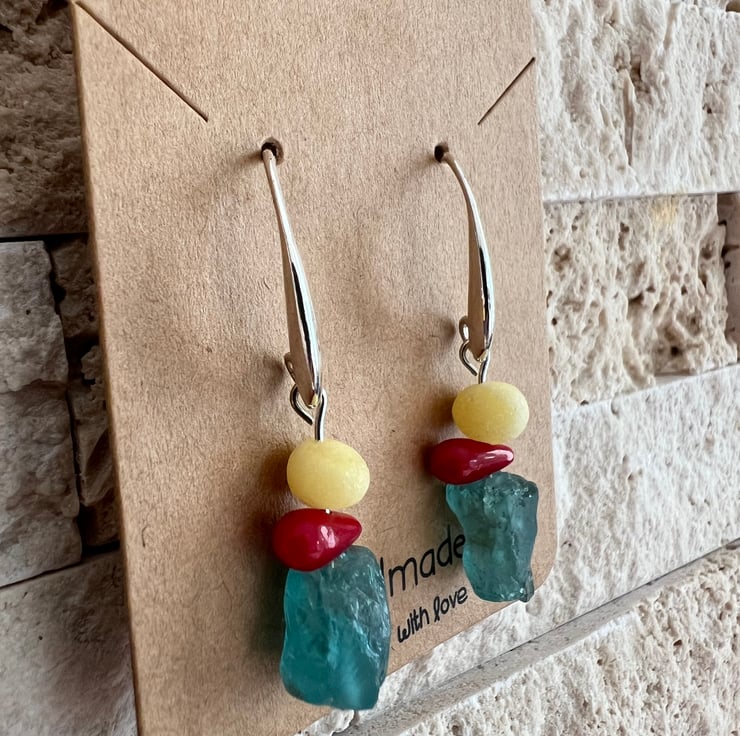 These sterling silver drop earrings showcase a striking mix of raw amber,raw apatite and red coral.The warm golden tones of amber contrast beautifully with the cool earthy blue-green of apatite and the vibrant pop of red coral,creating a bold yet natural look.