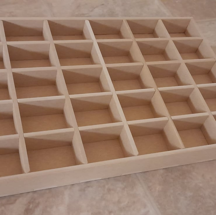 This item is a wooden storage tray with removable dividers. As shown in my photos, this tray measures 43.2cm x 28.6cm x 4.1cm. The tray has 30 compartments, with each pocket measuring 6.5cm x 5cm x 3.5cm deep. The dividers can be removed if preferred as they simply slot into place.
