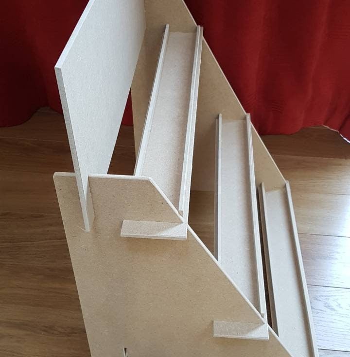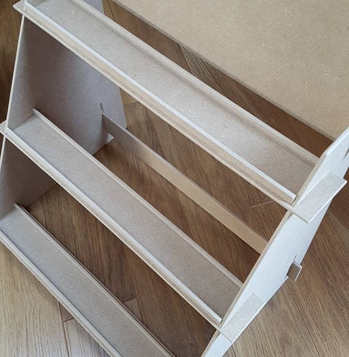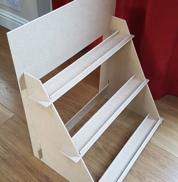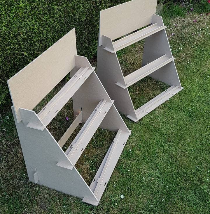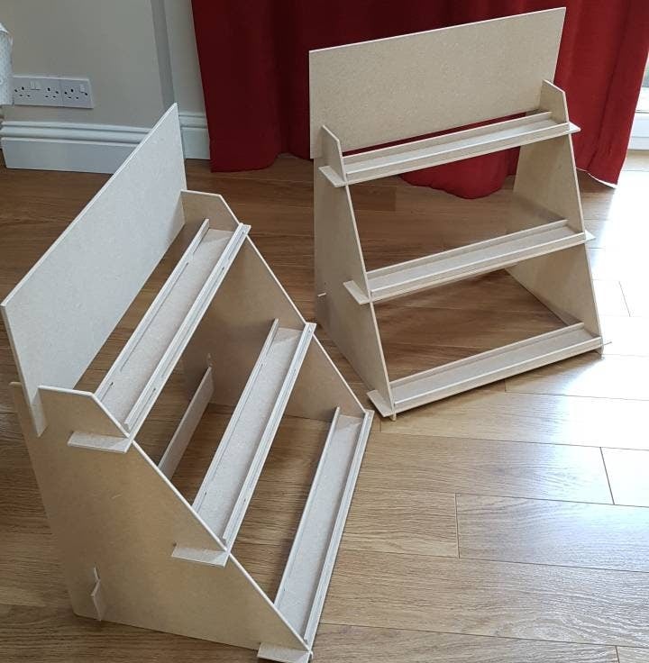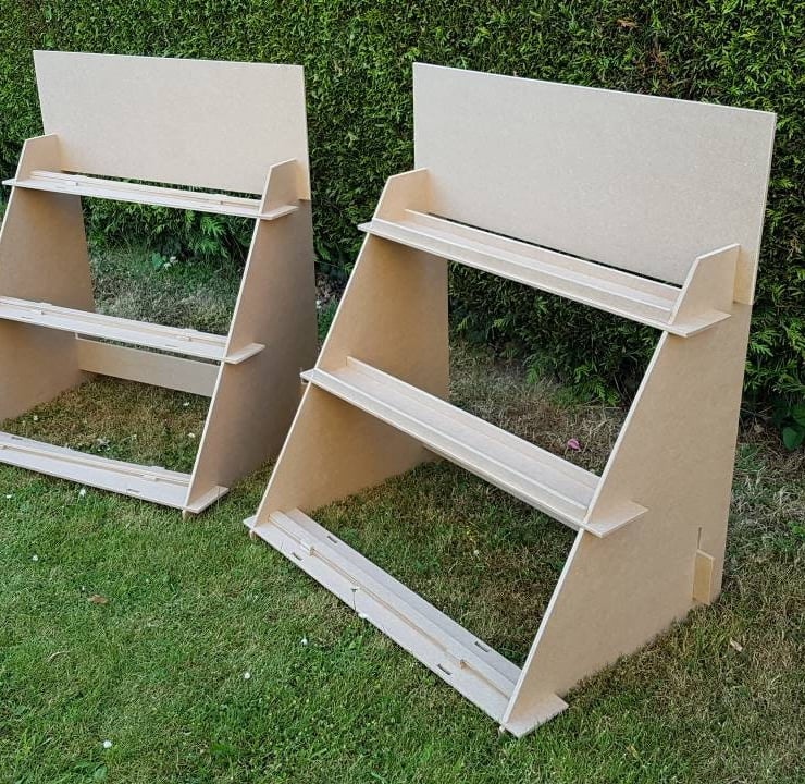 Being a flat packing display stand, this is ideal for craft fairs or shop displays. The stand consists of three shelves, two ends, a back support and a brace, making it compact and lightweight for transportation. It's also very quick and easy to assemble & dismantle. It doesn't require any screws, glues or other fixings (it simply slots together).